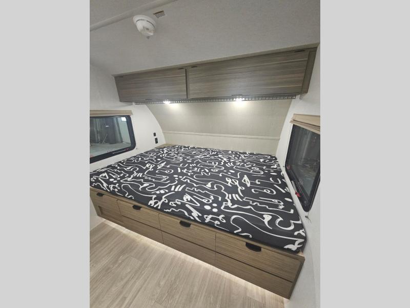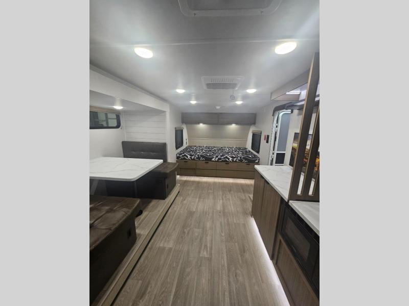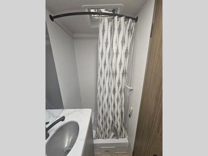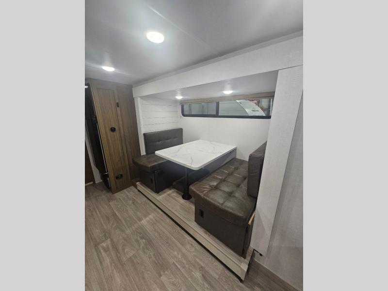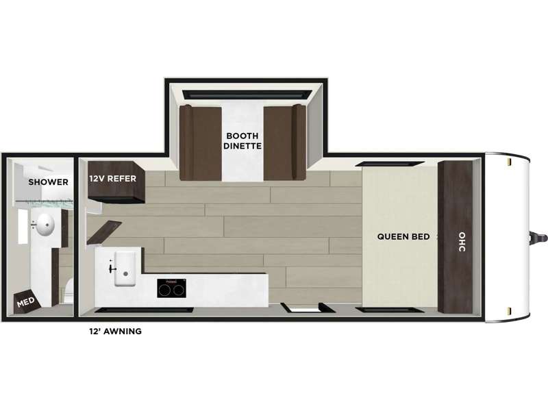 It will be so easy to enjoy time spent in this travel trailer for three. The front queen bed provides a great night's rest, and there is an overhead cabinet to keep your things organized. A two-burner cooktop in the kitchen will let you make meals for your crew, and a refrigerator keeps leftovers fresh. You can dine at the booth dinette within the slide out or take your plate outdoors to sit under the 12' power awning. And a full rear bath with a shower, toilet, and large vanity counter lets you stay clean each day!