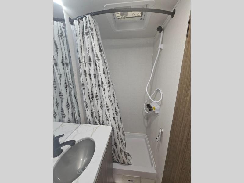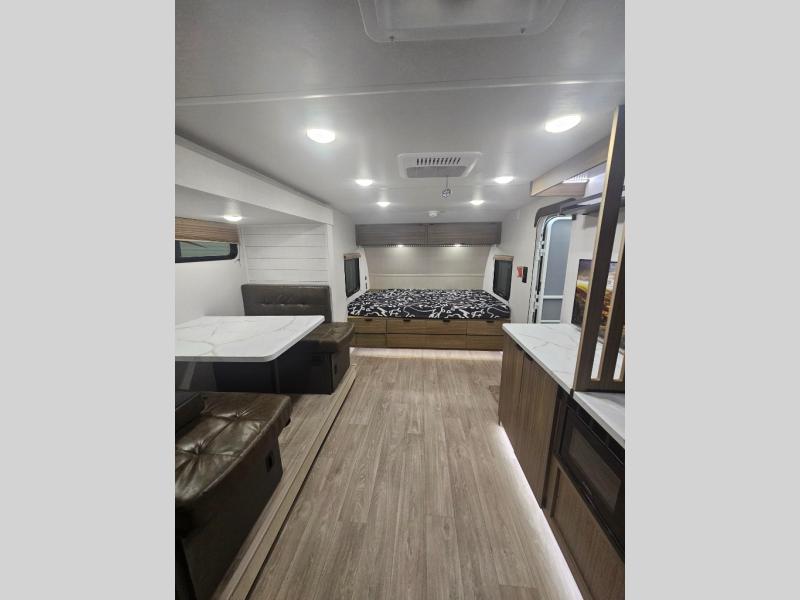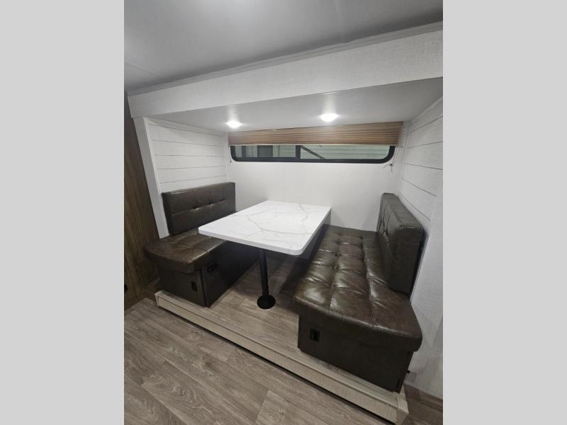 It will be so easy to enjoy time spent in this travel trailer for three. The front queen bed provides a great night's rest, and there is an overhead cabinet to keep your things organized. A two-burner cooktop in the kitchen will let you make meals for your crew, and a refrigerator keeps leftovers fresh. You can dine at the booth dinette within the slide out or take your plate outdoors to sit under the 12' power awning. And a full rear bath with a shower, toilet, and large vanity counter lets you stay clean each day!