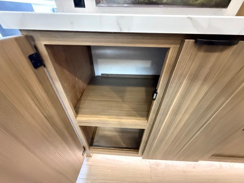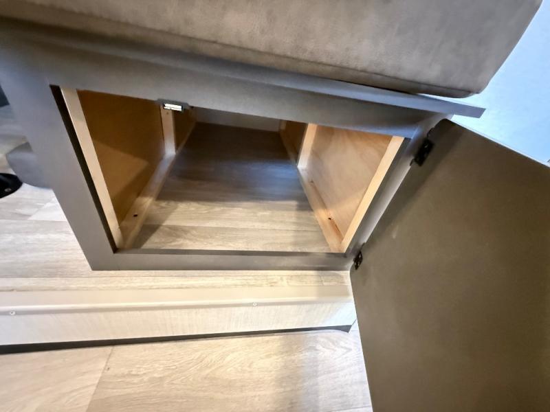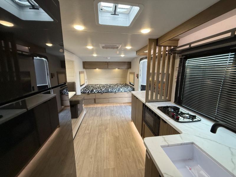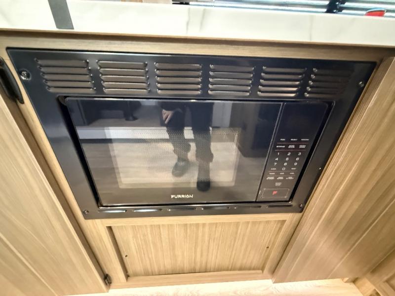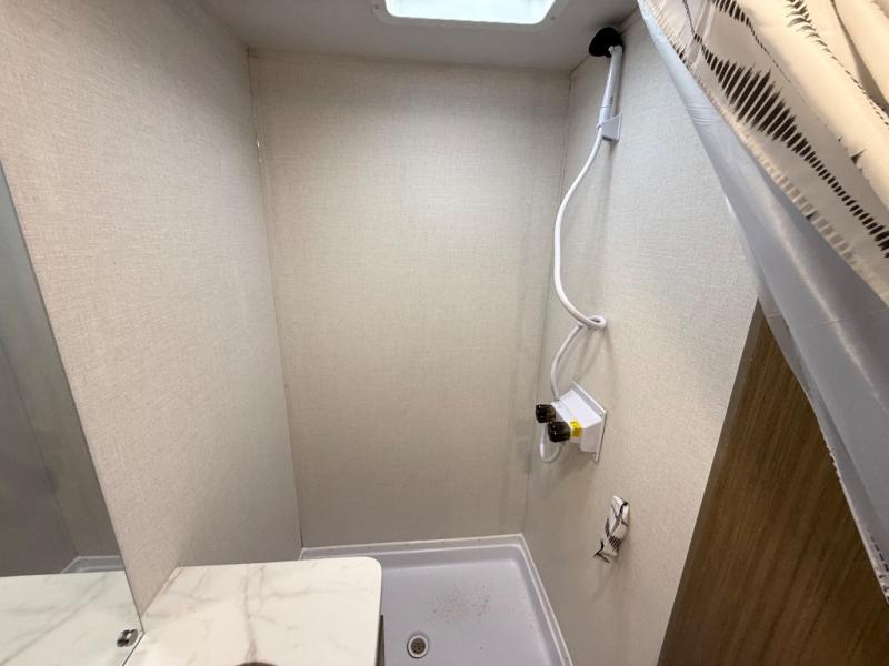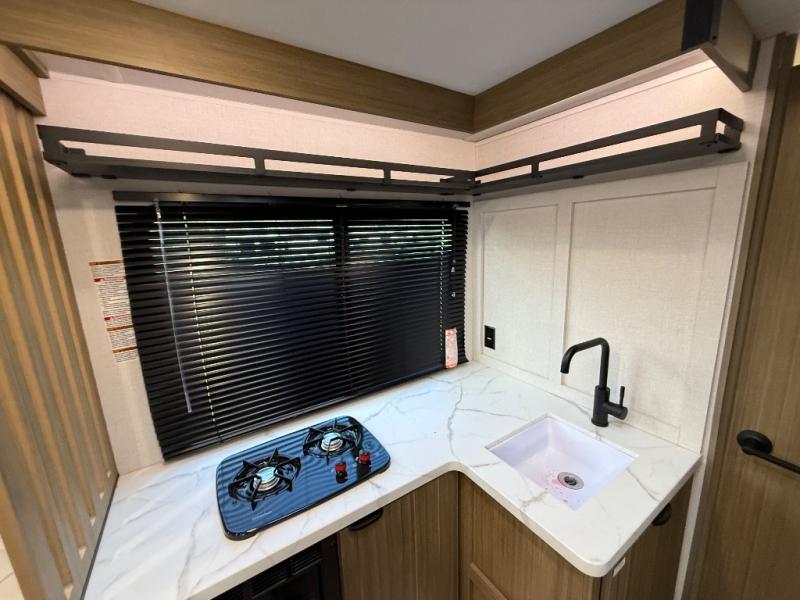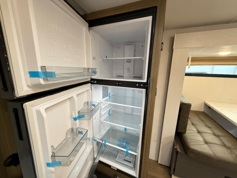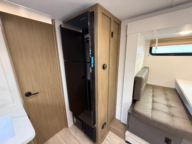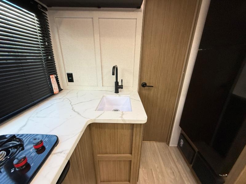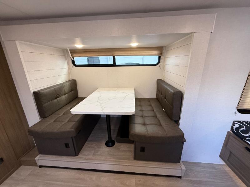 It will be so easy to enjoy time spent in this travel trailer for three. The front queen bed provides a great night's rest, and there is an overhead cabinet to keep your things organized. A two-burner cooktop in the kitchen will let you make meals for your crew, and a refrigerator keeps leftovers fresh. You can dine at the booth dinette within the slide out or take your plate outdoors to sit under the 12' power awning. And a full rear bath with a shower, toilet, and large vanity counter lets you stay clean each day!