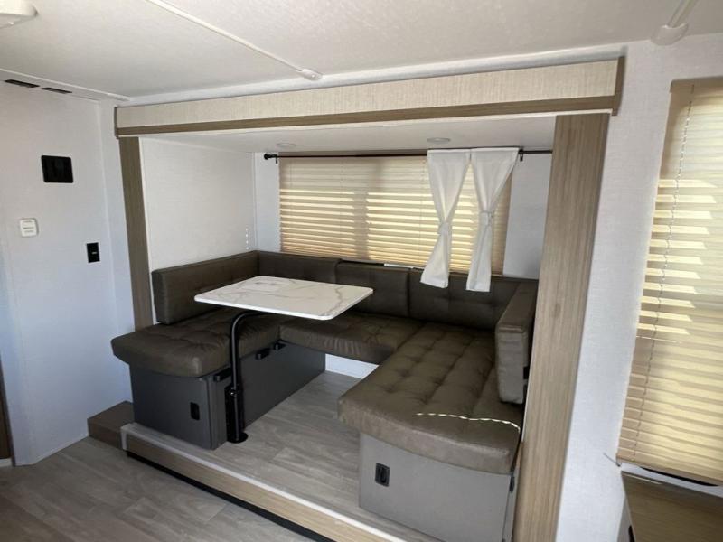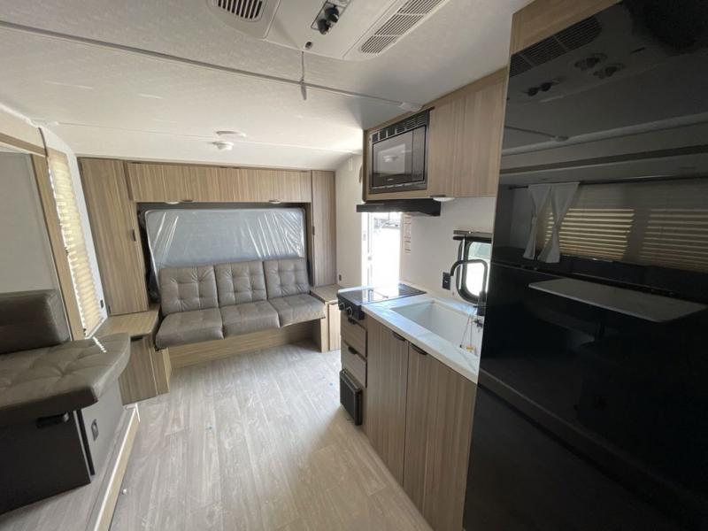 Bring your whole crew along for trips in this roomy travel trailer that can sleep eight people each night. Once you've set up the 14' power awning with LED lights, make lunch on the outside kitchen. Explore some trails or take your fishing poles down to the river, then head back to the trailer to clean up in the full bath. The kids may want to rest on the double-size bunks, while the adults play a game around the U-shaped dinette. This model also includes a sofa plus a Murphy bed that lowers over the sofa when you're ready for bed. Don't let this travel trailer slip away!