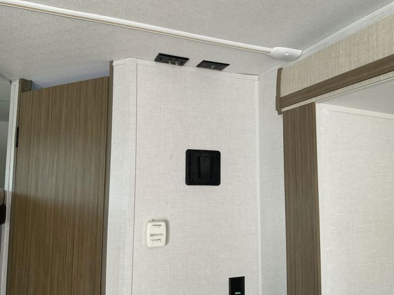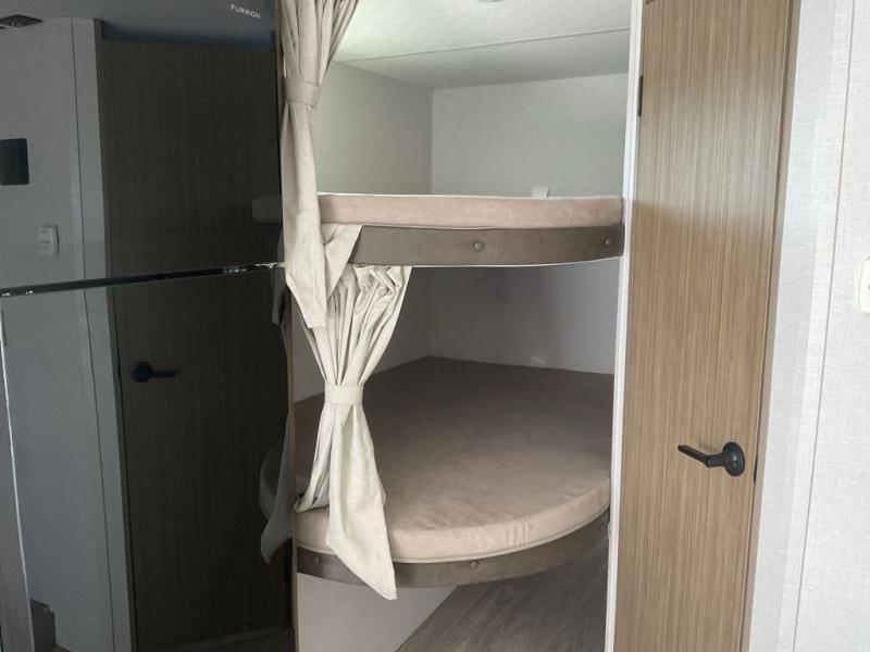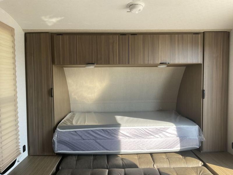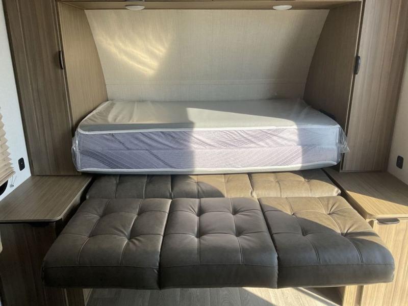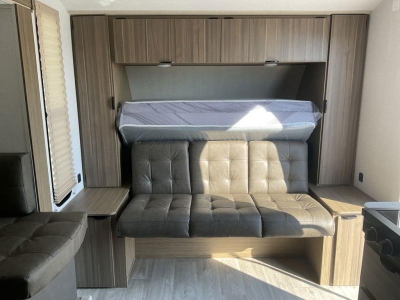Bring your whole crew along for trips in this roomy travel trailer that can sleep eight people each night. Once you've set up the 14' power awning with LED lights, make lunch on the outside kitchen. Explore some trails or take your fishing poles down to the river, then head back to the trailer to clean up in the full bath. The kids may want to rest on the double-size bunks, while the adults play a game around the U-shaped dinette. This model also includes a sofa plus a Murphy bed that lowers over the sofa when you're ready for bed. Don't let this travel trailer slip away!