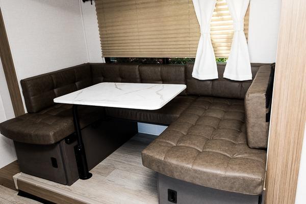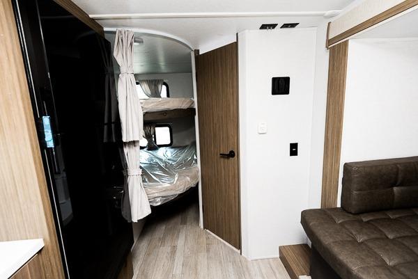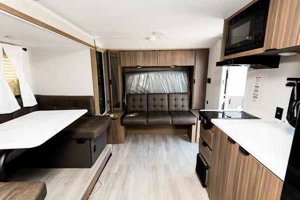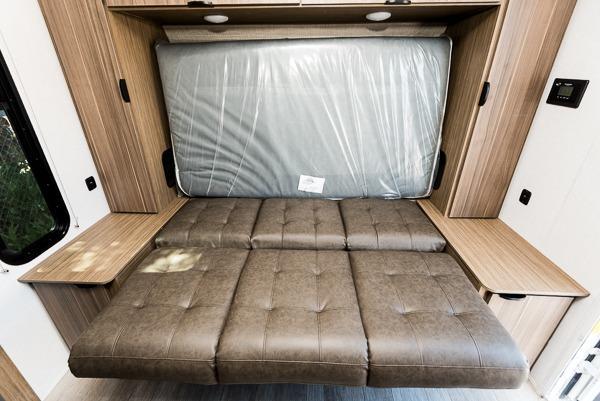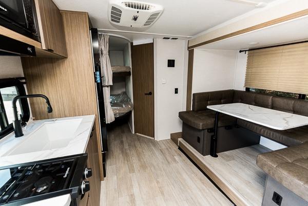 Bring your whole crew along for trips in this roomy travel trailer that can sleep eight people each night. Once you've set up the 14' power awning with LED lights, make lunch on the outside kitchen. Explore some trails or take your fishing poles down to the river, then head back to the trailer to clean up in the full bath. The kids may want to rest on the double-size bunks, while the adults play a game around the U-shaped dinette. This model also includes a sofa plus a Murphy bed that lowers over the sofa when you're ready for bed. Don't let this travel trailer slip away!