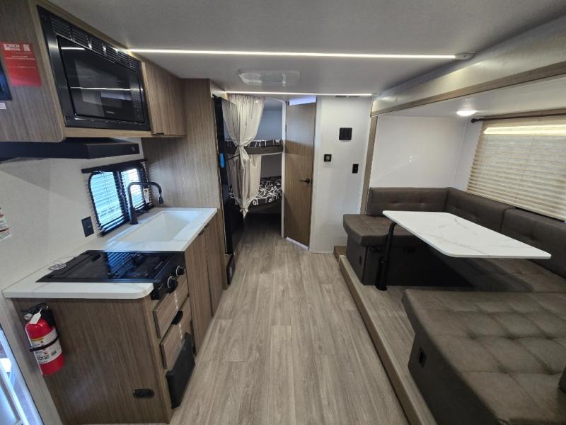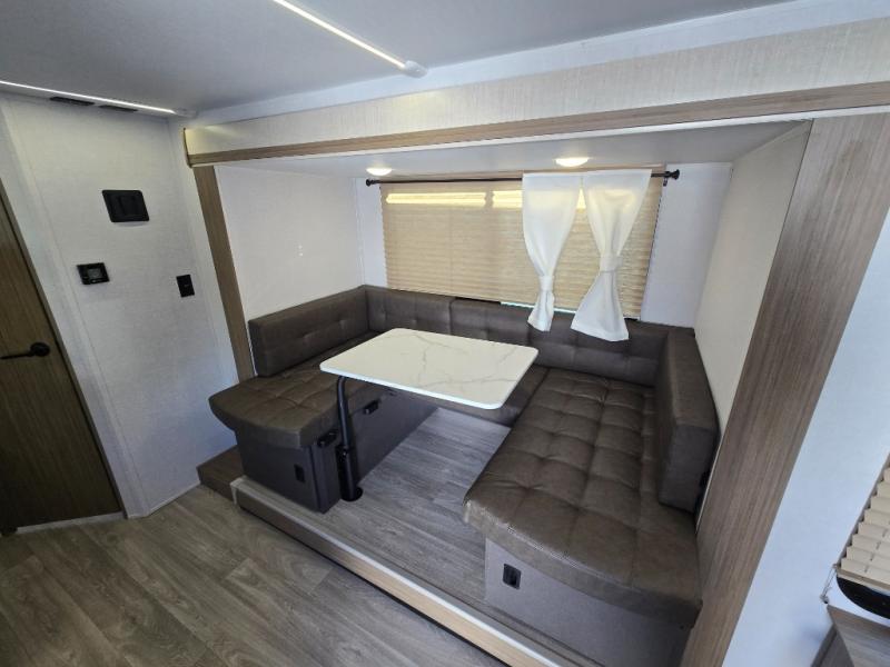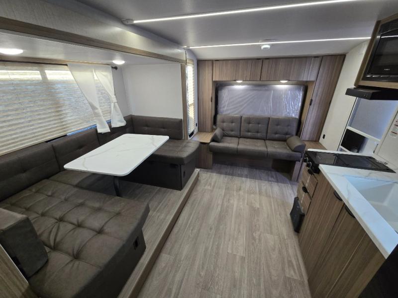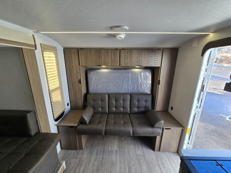 Bring your whole crew along for trips in this roomy travel trailer that can sleep eight people each night. Once you've set up the 14' power awning with LED lights, relax in your camp chairs before stretching your legs. Explore some trails or take your fishing poles down to the river, then head back to the trailer to clean up in the full bath. The kids may want to rest on the double-size bunks, while the adults play a game around the U-shaped dinette. This model also includes a sofa plus a Murphy bed that lowers over the sofa when you're ready for bed. Don't let this travel trailer slip away!