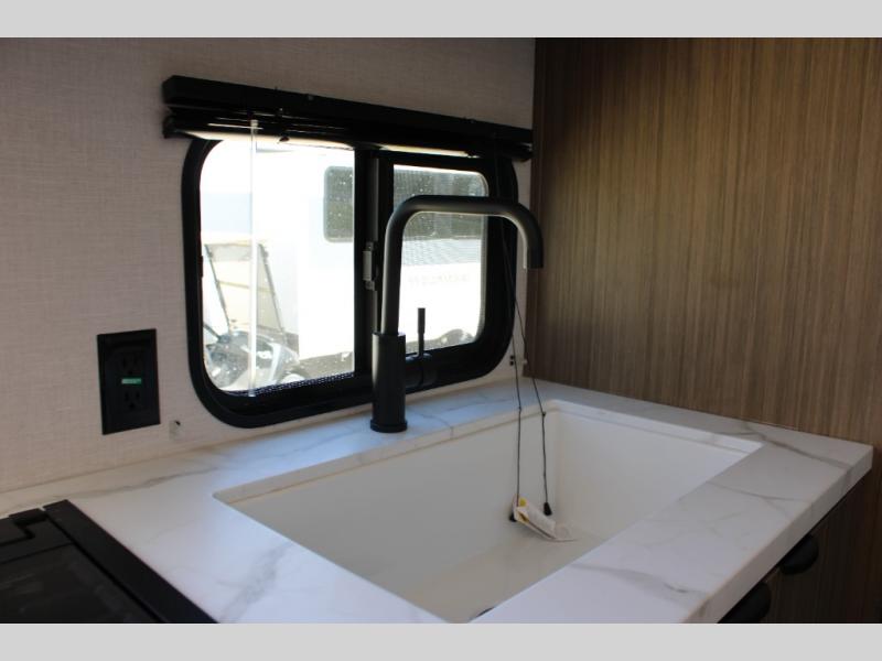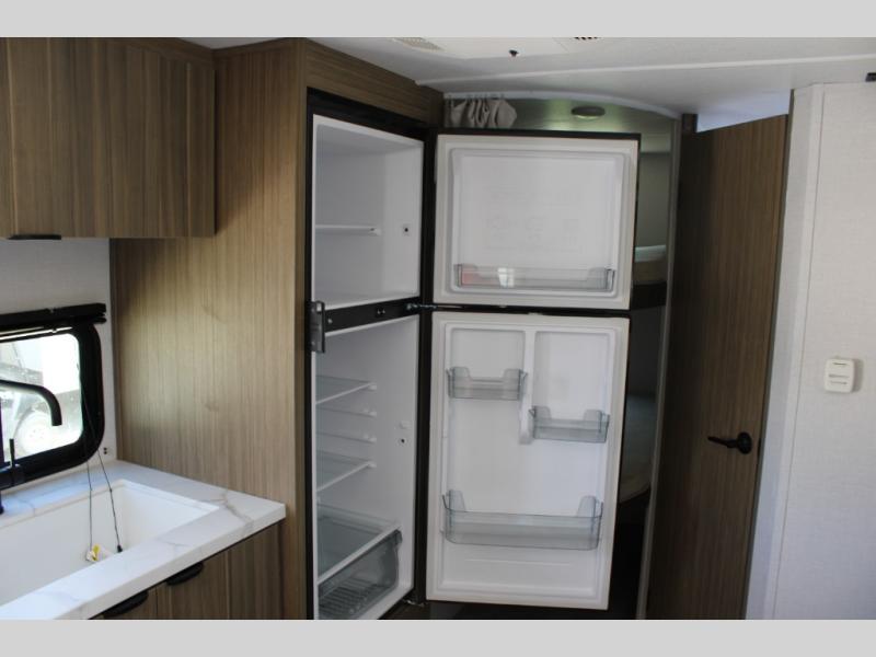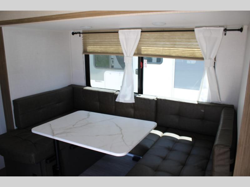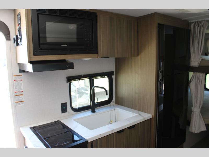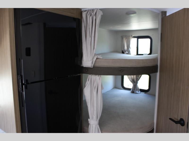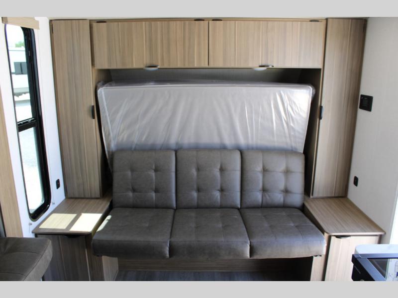 Bring your whole crew along for trips in this roomy travel trailer that can sleep eight people each night. Once you've set up the 14' power awning with LED lights, make lunch on the outdoor kitchen. Explore some trails or take your fishing poles down to the river, then head back to the trailer to clean up in the full bath. The kids may want to rest on the double-size bunks, while the adults play a game around the U-shaped dinette. This model also includes a sofa plus a Murphy bed that lowers over the sofa when you're ready for bed. Don't let this travel trailer slip away!