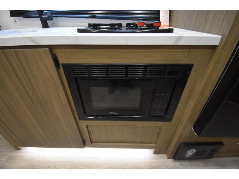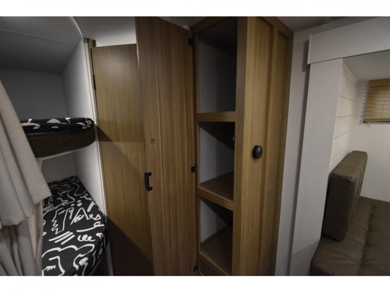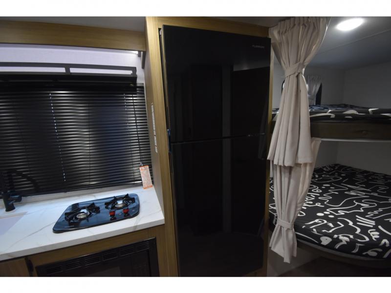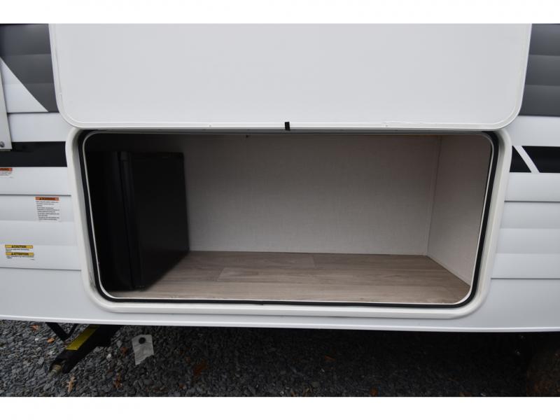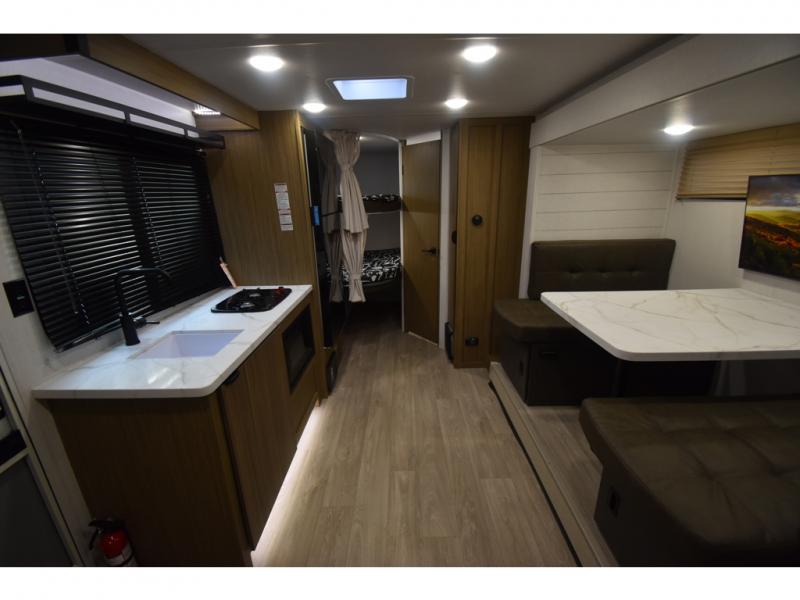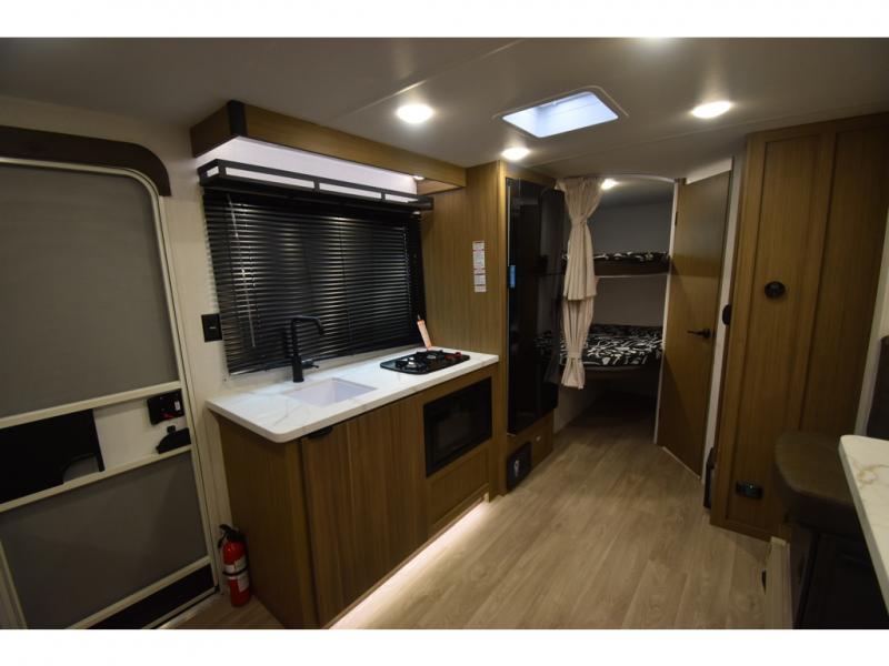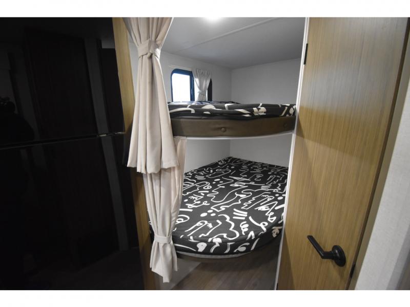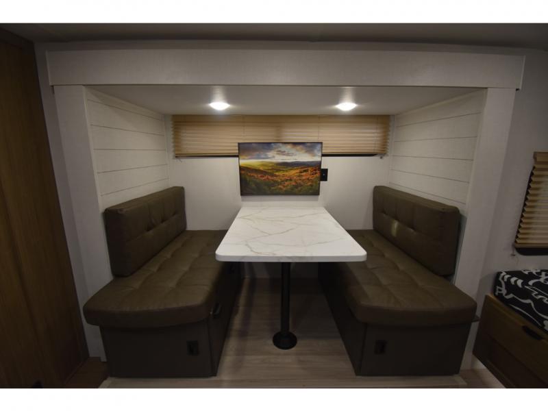 It will be so easy to enjoy time spent in this travel trailer for seven. The front queen bed provides a great night's rest, and there is an overhead cabinet to keep your things organized. Your guests or little ones can claim the double-size bunks for themselves, and there is a full bath adjacent to the bunks for easy nighttime use. A two-burner cooktop in the kitchen will let you make meals for your crew, and a refrigerator keeps leftovers fresh. You can dine at the booth dinette within the slide out or take your plate outdoors to sit under the 15' power awning.