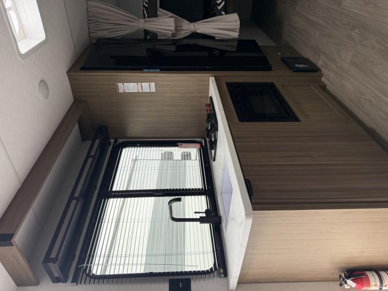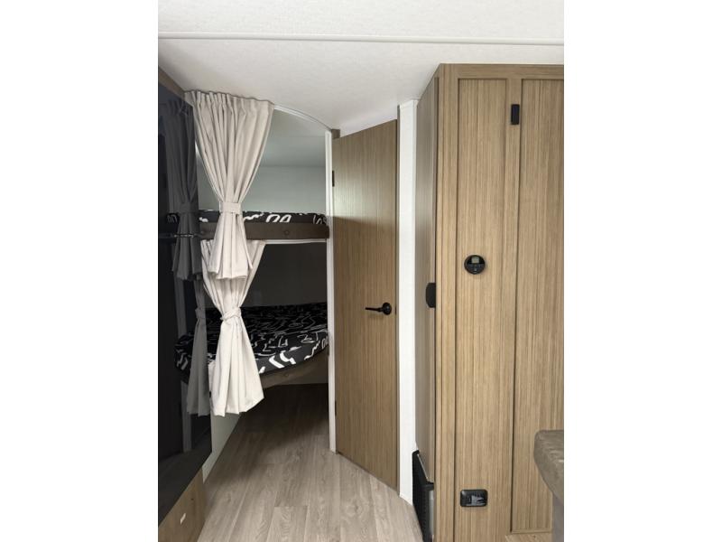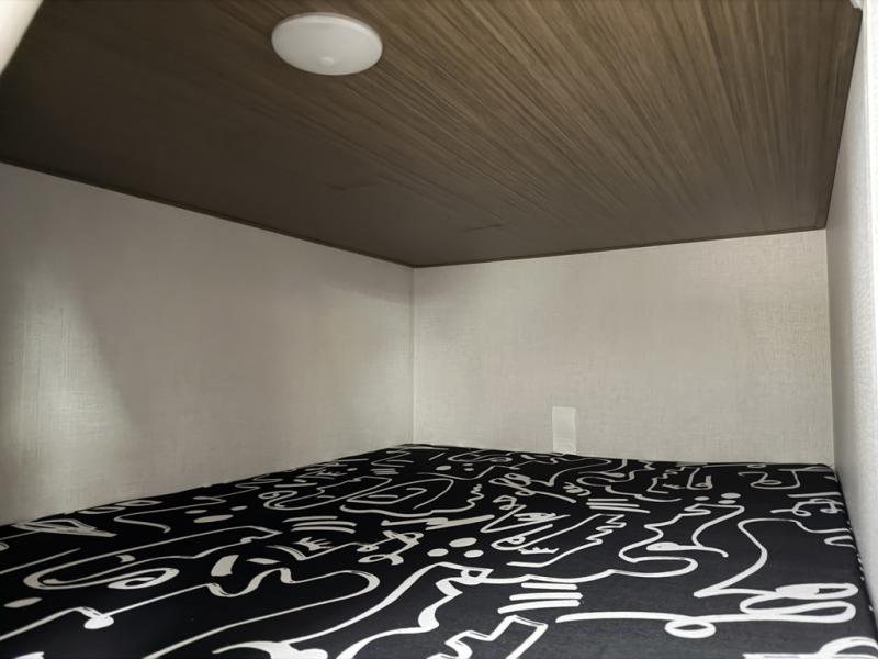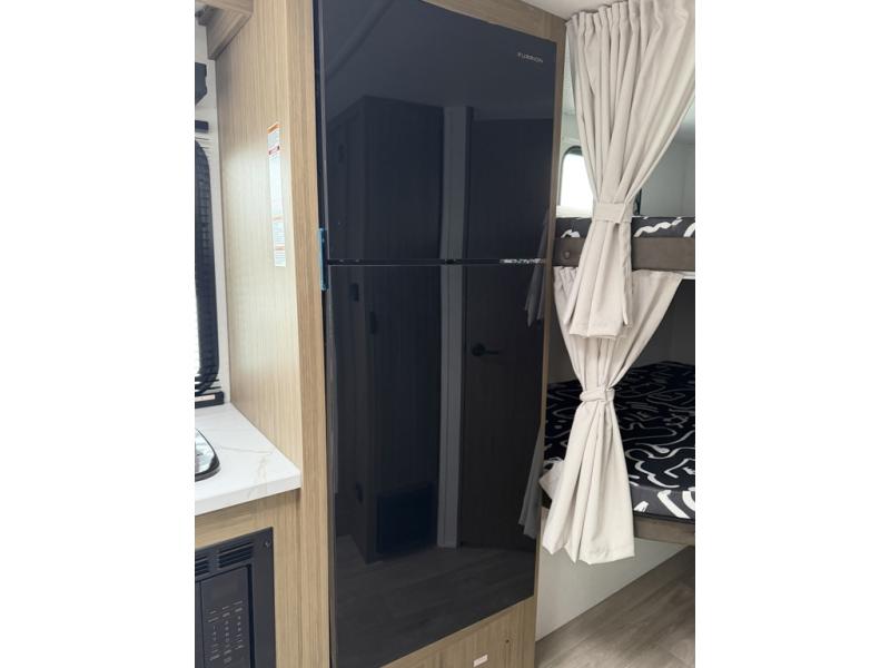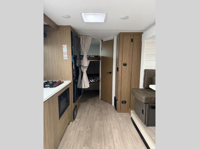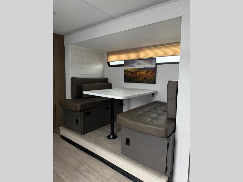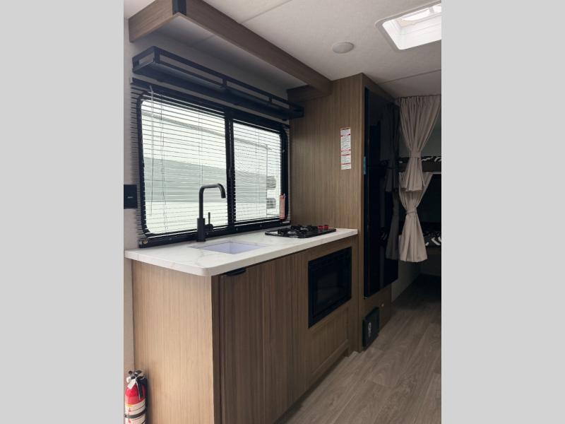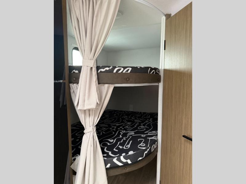 It will be so easy to enjoy time spent in this travel trailer for seven. The front queen bed provides a great night's rest, and there is an overhead cabinet to keep your things organized. Your guests or little ones can claim the double-size bunks for themselves, and there is a full bath adjacent to the bunks for easy nighttime use. A two-burner cooktop in the kitchen will let you make meals for your crew, and a refrigerator keeps leftovers fresh. You can dine at the booth dinette within the slide out or take your plate outdoors to sit under the 15' power awning.