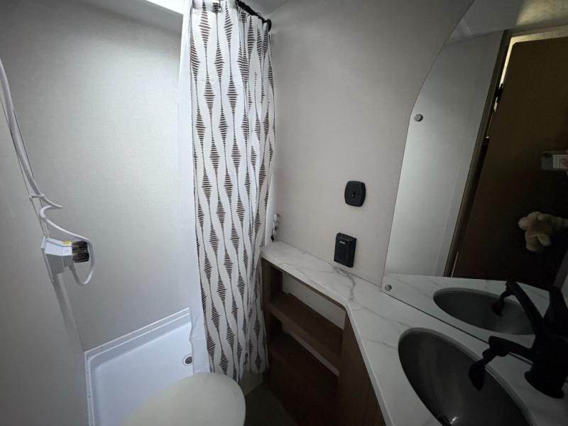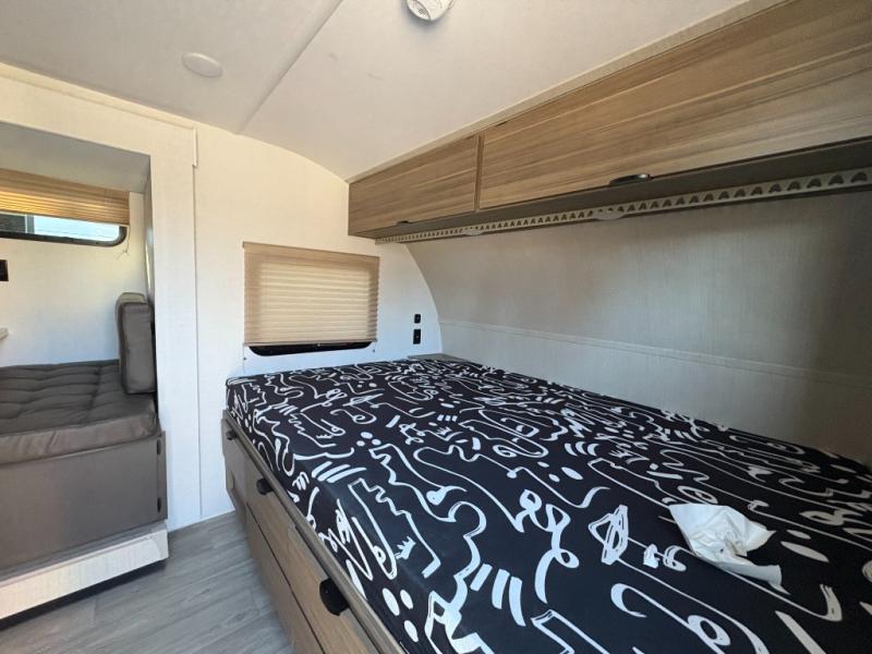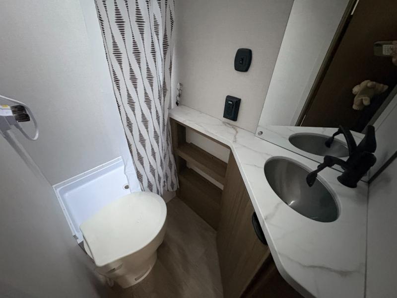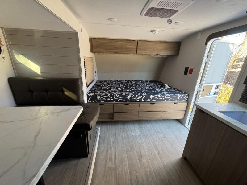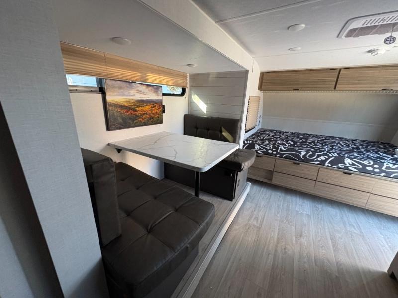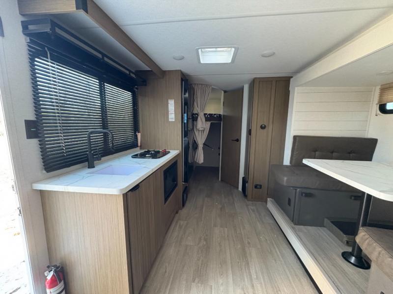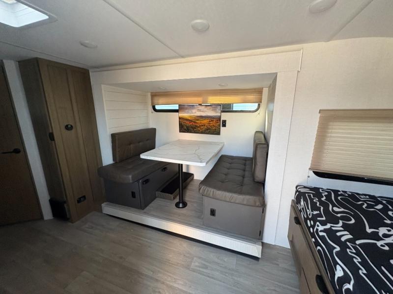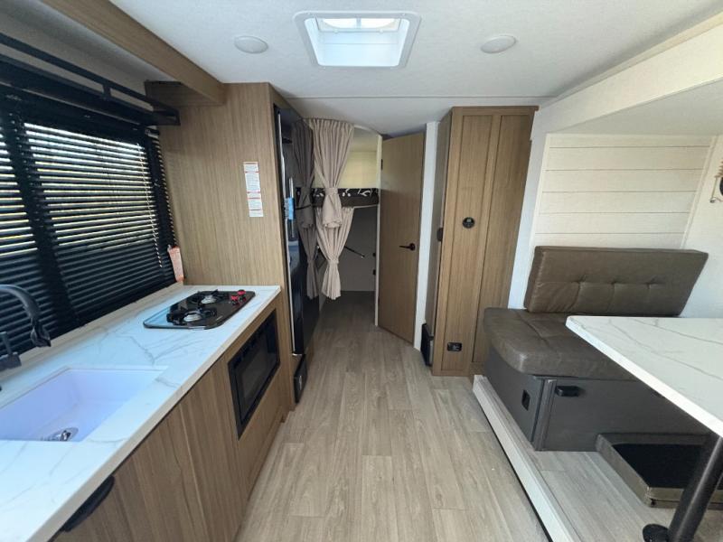 It will be so easy to enjoy time spent in this travel trailer for seven. The front queen bed provides a great night's rest, and there is an overhead cabinet to keep your things organized. Your guests or little ones can claim the double-size bunks for themselves, and there is a full bath adjacent to the bunks for easy nighttime use. A two-burner cooktop in the kitchen will let you make meals for your crew, and a refrigerator keeps leftovers fresh. You can dine at the booth dinette within the slide out or take your plate outdoors to sit under the 15' power awning.