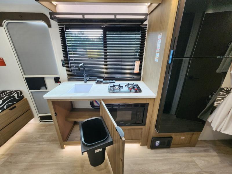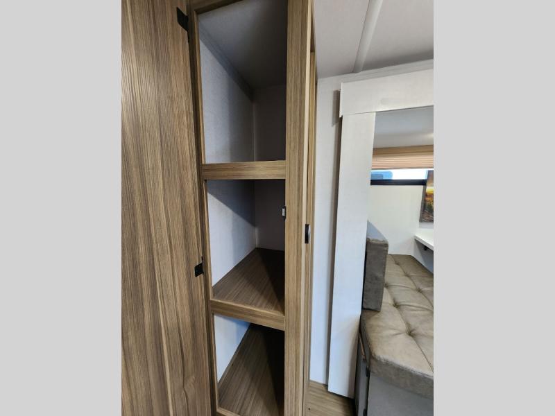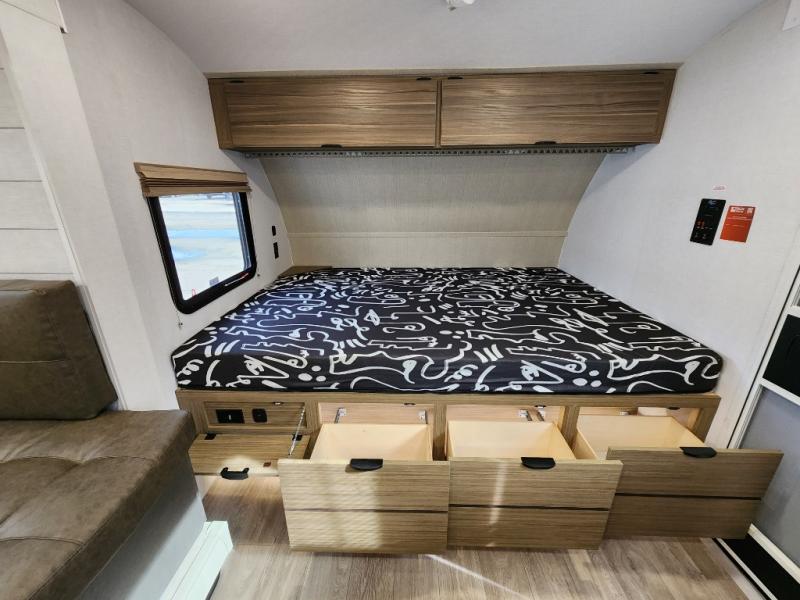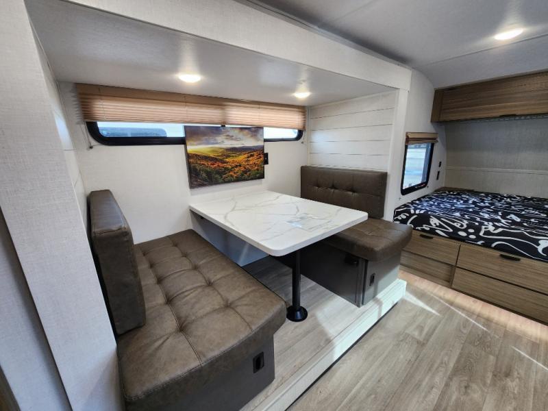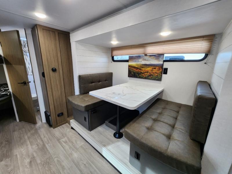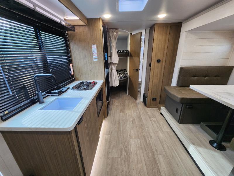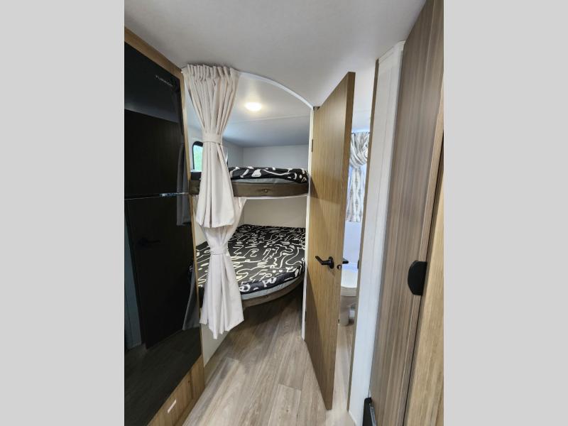 It will be so easy to enjoy time spent in this travel trailer for seven. The front queen bed provides a great night's rest, and there is an overhead cabinet to keep your things organized. Your guests or little ones can claim the double-size bunks for themselves, and there is a full bath adjacent to the bunks for easy nighttime use. A two-burner cooktop in the kitchen will let you make meals for your crew, and a refrigerator keeps leftovers fresh. You can dine at the booth dinette within the slide out or take your plate outdoors to sit under the 15' power awning.