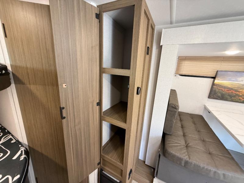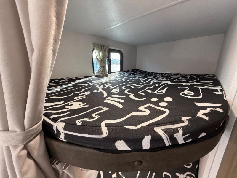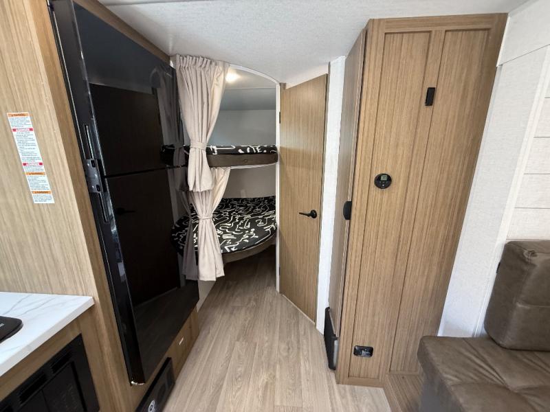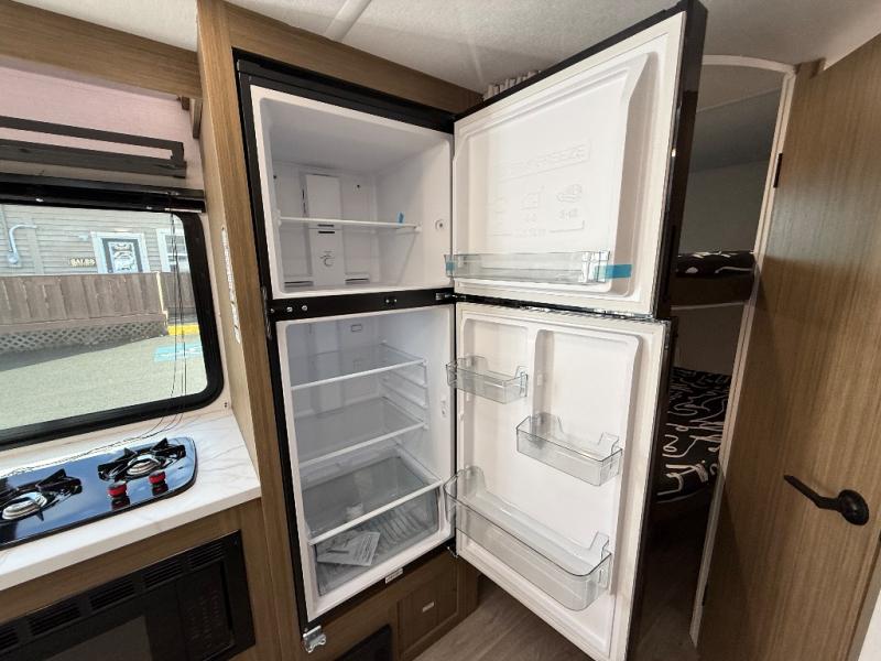 It will be so easy to enjoy time spent in this travel trailer for seven. The front queen bed provides a great night's rest, and there is an overhead cabinet to keep your things organized. Your guests or little ones can claim the double-size bunks for themselves, and there is a full bath adjacent to the bunks for easy nighttime use. A two-burner cooktop in the kitchen will let you make meals for your crew, and a refrigerator keeps leftovers fresh. You can dine at the booth dinette within the slide out or take your plate outdoors to sit under the 15' power awning.
