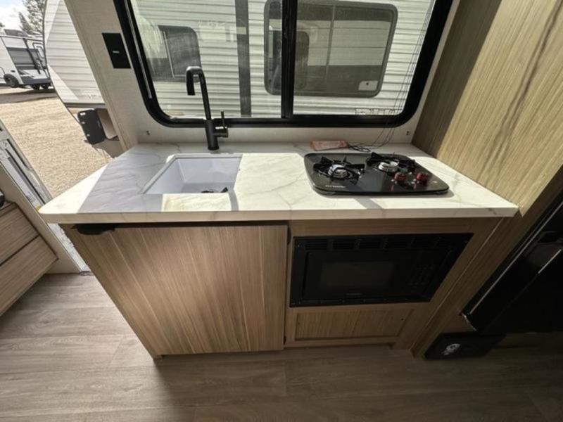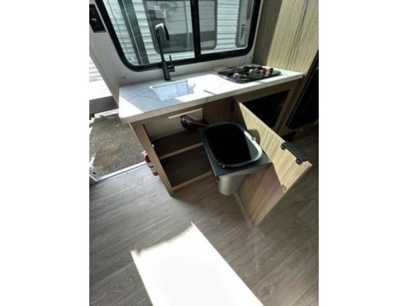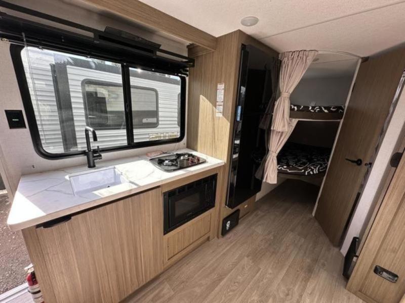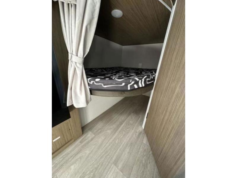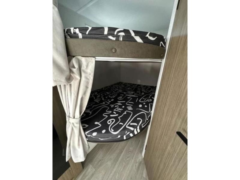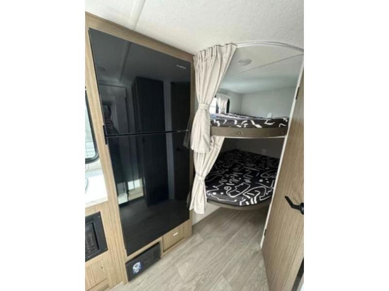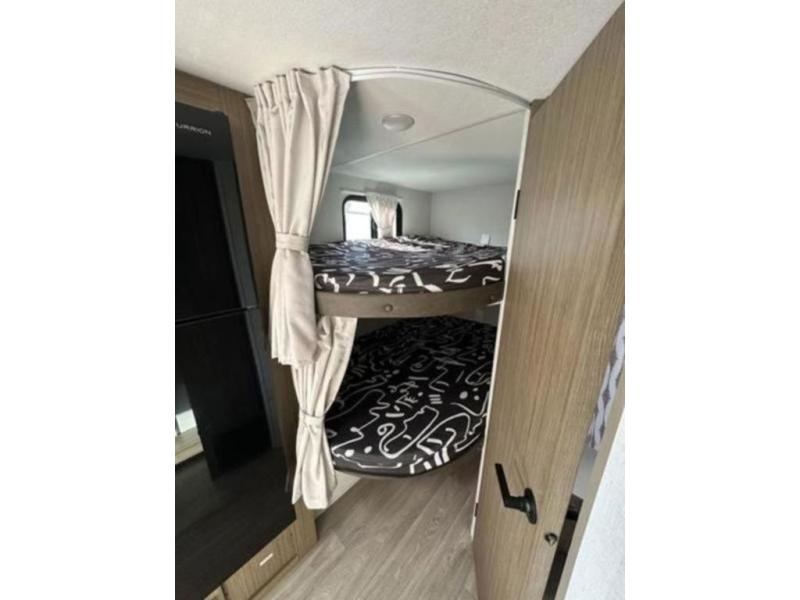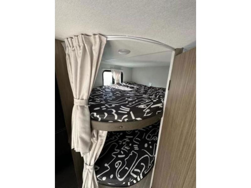 It will be so easy to enjoy time spent in this travel trailer for seven. The front queen bed provides a great night's rest, and there is an overhead cabinet to keep your things organized. Your guests or little ones can claim the double-size bunks for themselves, and there is a full bath adjacent to the bunks for easy nighttime use. A two-burner cooktop in the kitchen will let you make meals for your crew, and a refrigerator keeps leftovers fresh. You can dine at the booth dinette within the slide out or take your plate outdoors to sit under the 15' power awning.