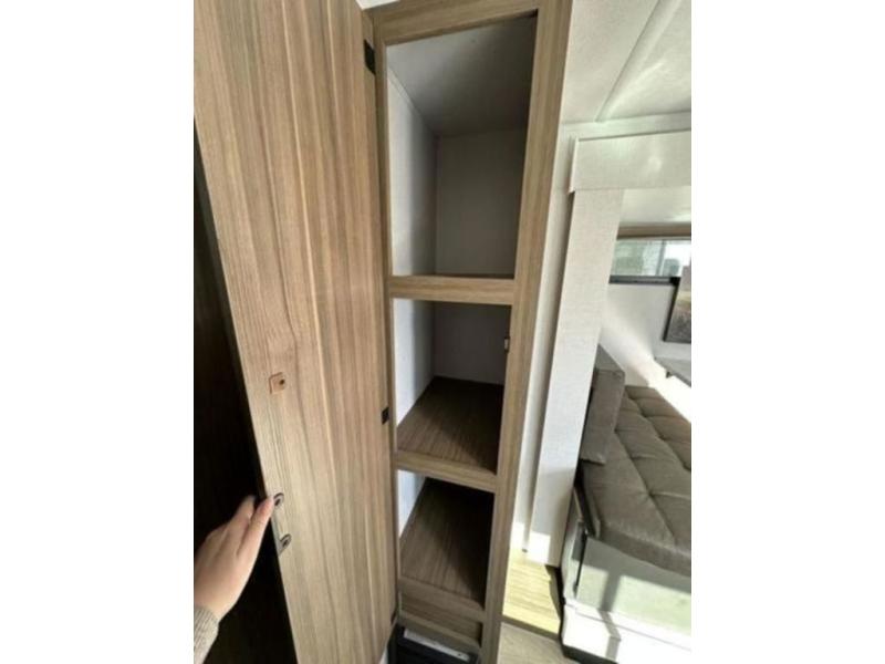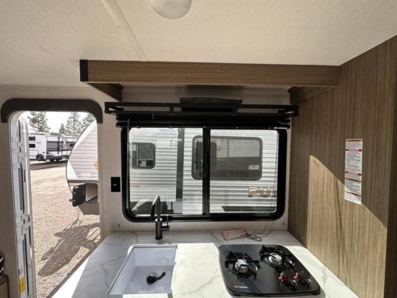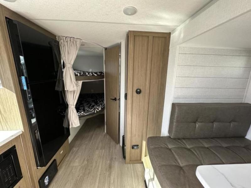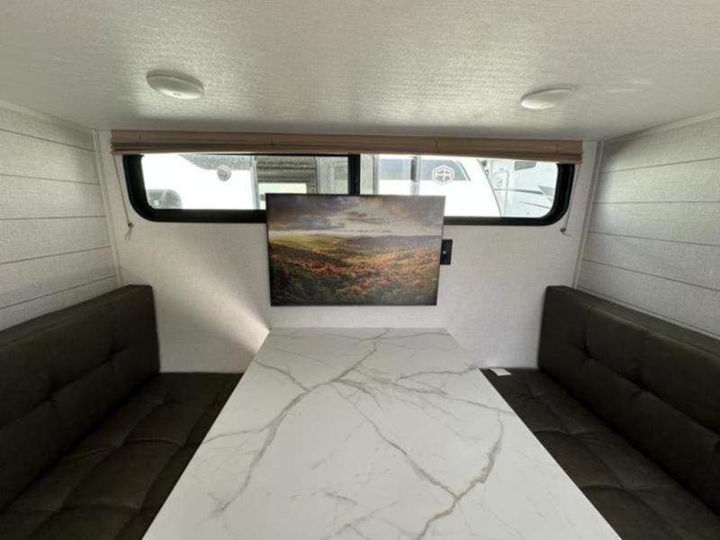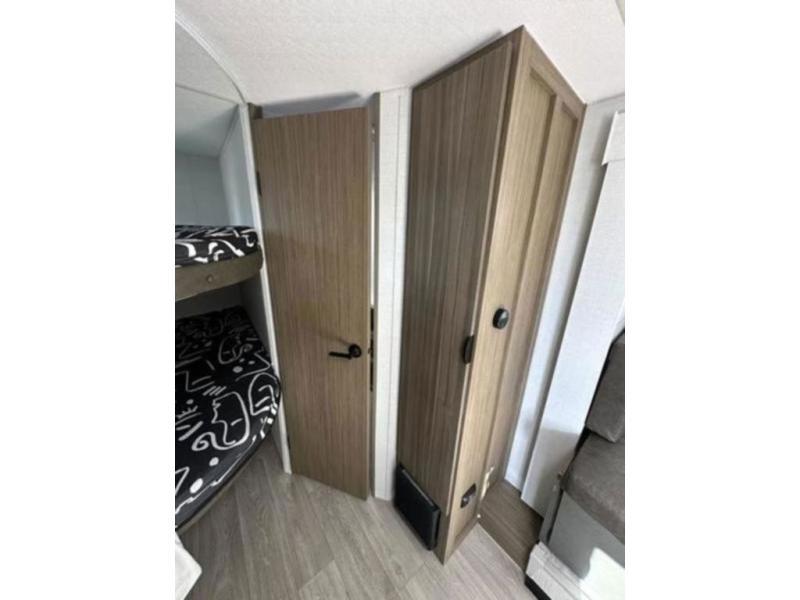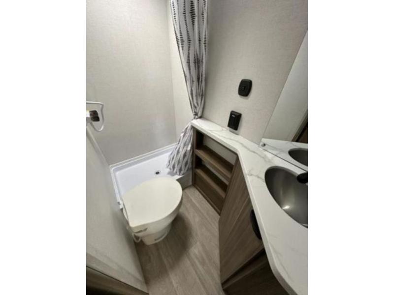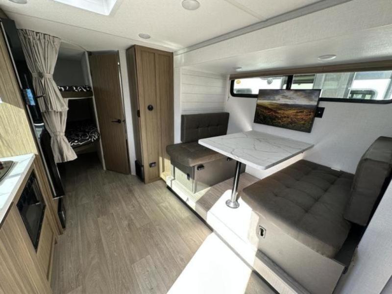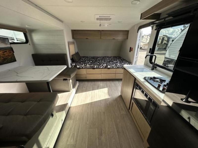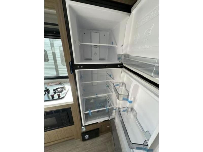 It will be so easy to enjoy time spent in this travel trailer for seven. The front queen bed provides a great night's rest, and there is an overhead cabinet to keep your things organized. Your guests or little ones can claim the double-size bunks for themselves, and there is a full bath adjacent to the bunks for easy nighttime use. A two-burner cooktop in the kitchen will let you make meals for your crew, and a refrigerator keeps leftovers fresh. You can dine at the booth dinette within the slide out or take your plate outdoors to sit under the 15' power awning.
