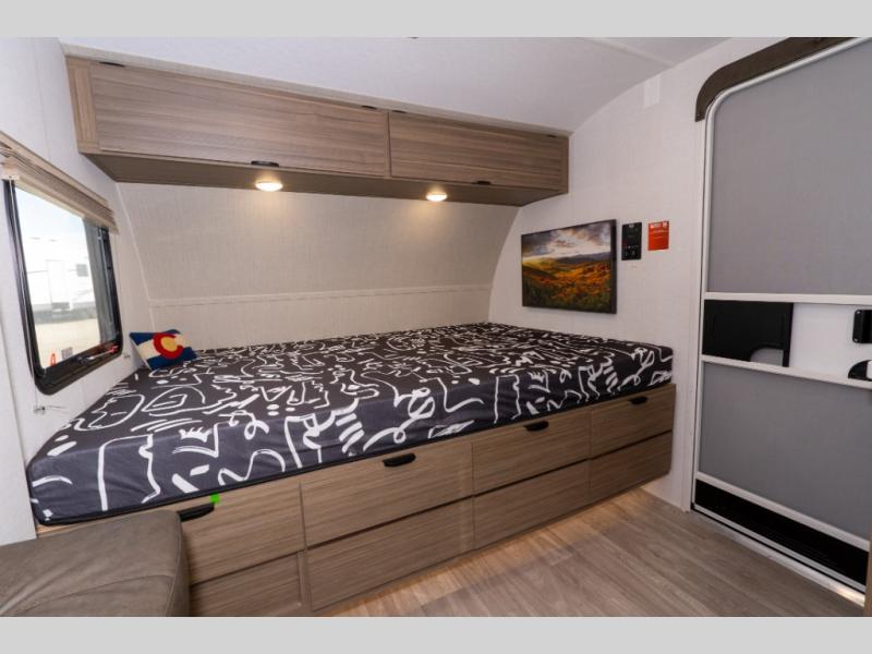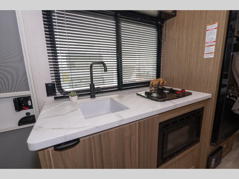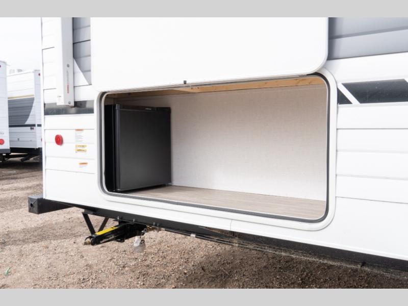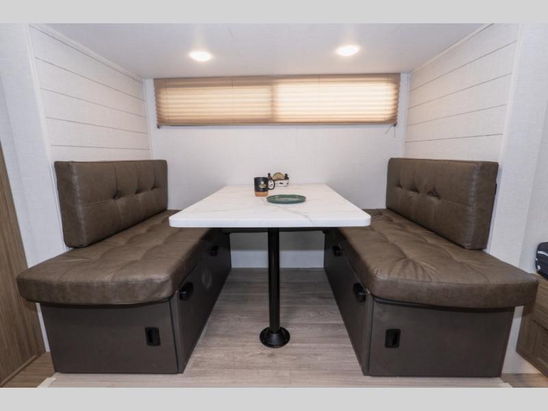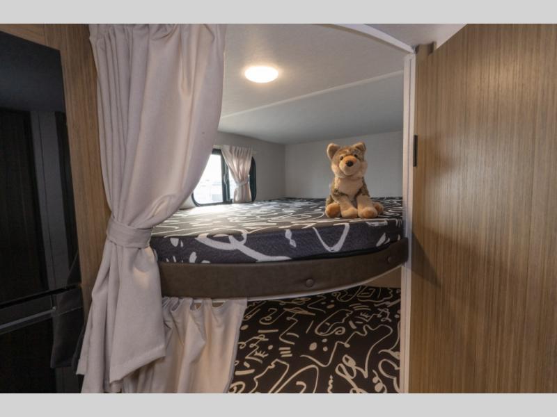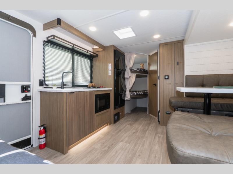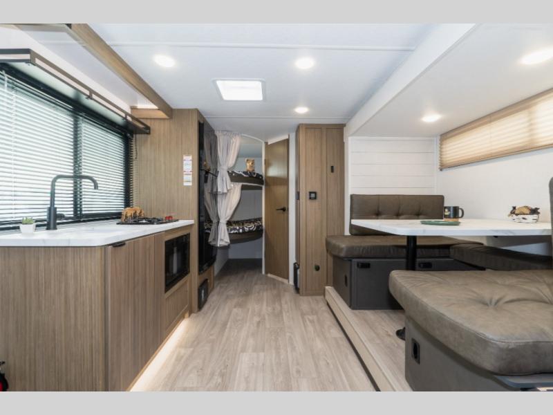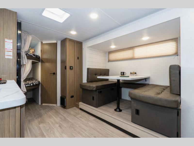 It will be so easy to enjoy time spent in this travel trailer for seven. The front queen bed provides a great night's rest, and there is an overhead cabinet to keep your things organized. Your guests or little ones can claim the double-size bunks for themselves, and there is a full bath adjacent to the bunks for easy nighttime use. A two-burner cooktop in the kitchen will let you make meals for your crew, and a refrigerator keeps leftovers fresh. You can dine at the booth dinette within the slide out or take your plate outdoors to sit under the 15' power awning.