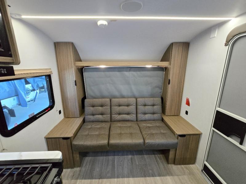 Find all you're looking for and more in this versatile travel trailer. The Murphy bed will be perfect for a great night's rest, and in the morning you can easily fold it up to relax on the sofa. The chef of your group can prepare breakfast on the two burner cooktop, or head outdoors to cook on the outside kitchen and enjoy the 14' power awning. The full bath allows you to stay clean all week, and the double-size bunks will be perfect for extra guests!