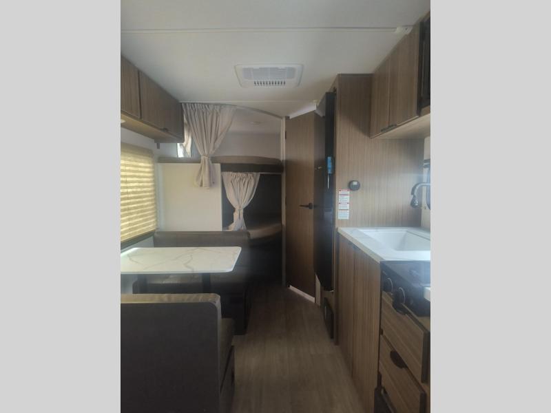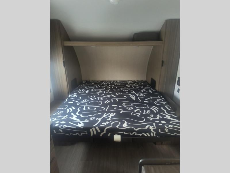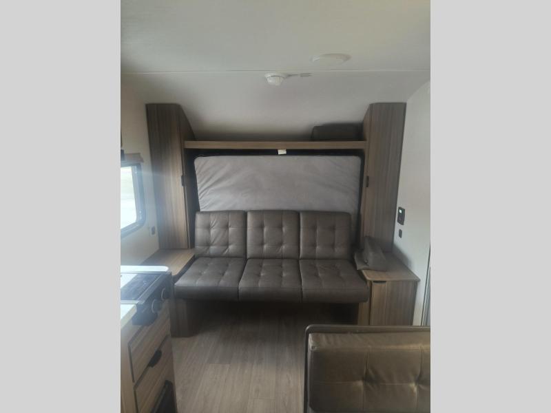 Find all you're looking for and more in this versatile travel trailer. The Murphy bed will be perfect for a great night's rest, and in the morning, you can easily fold it up to relax on the sofa. The chef of your group can prepare breakfast on the two-burner cooktop, or in the microwave oven, and there is an extra-large black glass 12V refrigerator. The full bath allows you to stay clean all week, and the double-size bunks will be perfect for extra guests!