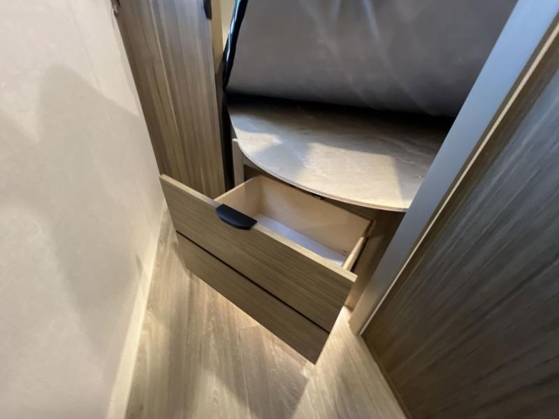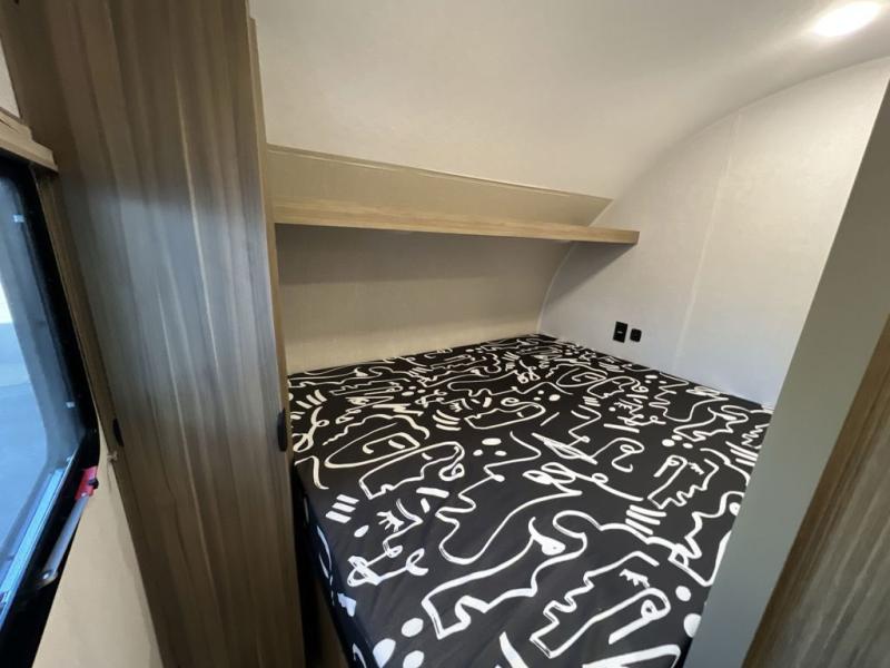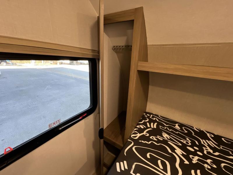 Your guest or little ones will love the bunk beds on this model since each bunk includes a private door which can be shut for privacy! You'll find the front 60" x 72" platform bed to be cozy and convenient since there are overhead cabinets and a closet for your things. Once you've made lunch on the two-burner cooktop, you can dine at the booth dinette slide out. There is also a 12V refrigerator here and shelves for more storage!