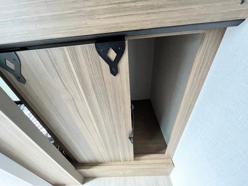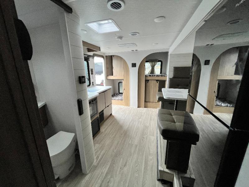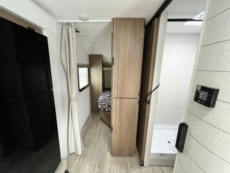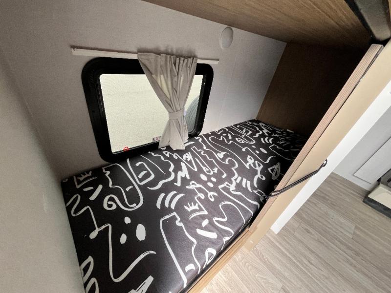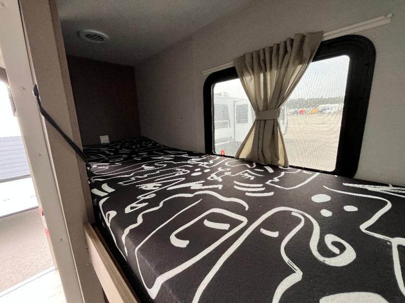 Your guest or little ones will love the bunk beds on this model since each bunk includes a private door which can be shut for privacy! You'll find the front 60" x 72" platform bed to be cozy and convenient since there are overhead cabinets and a closet for your things. Once you've made lunch on the two-burner cooktop, you can dine at the booth dinette slide out. There is also a 12V refrigerator here and shelves for more storage!