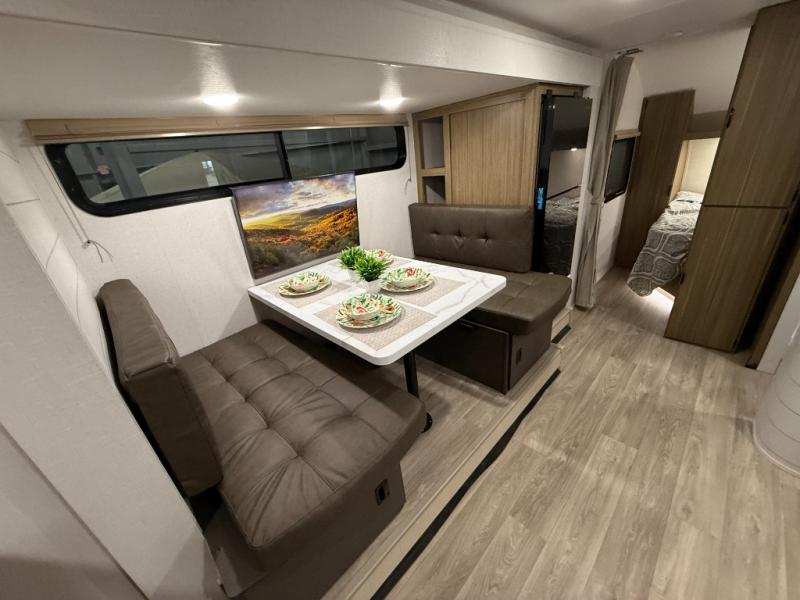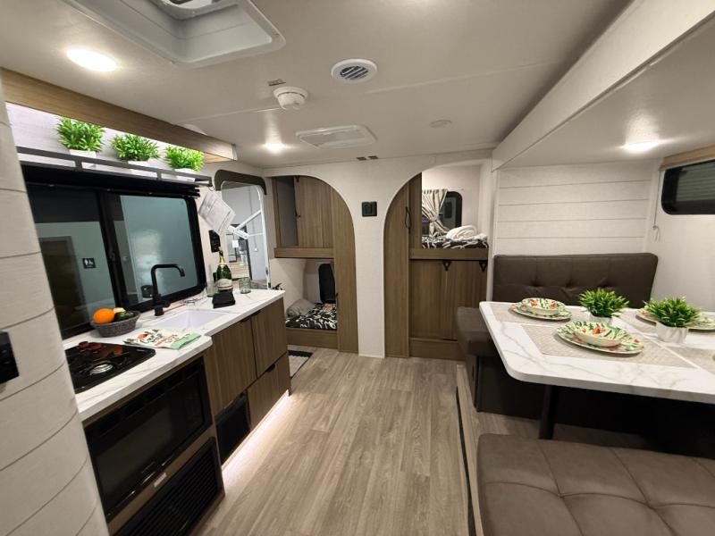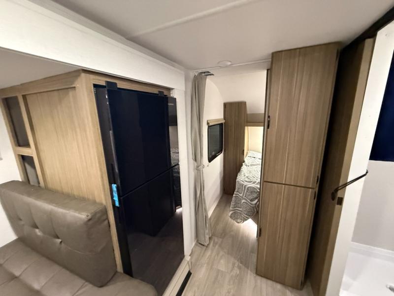 Your guest or little ones will love the bunk beds on this model since each bunk includes a private door which can be shut for privacy! You'll find the front 60" x 72" platform bed to be cozy and convenient since there are overhead cabinets and a closet for your things. Once you've made lunch on the two-burner cooktop, you can dine at the booth dinette slide out. There is also a 12V refrigerator here and shelves for more storage!