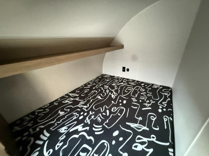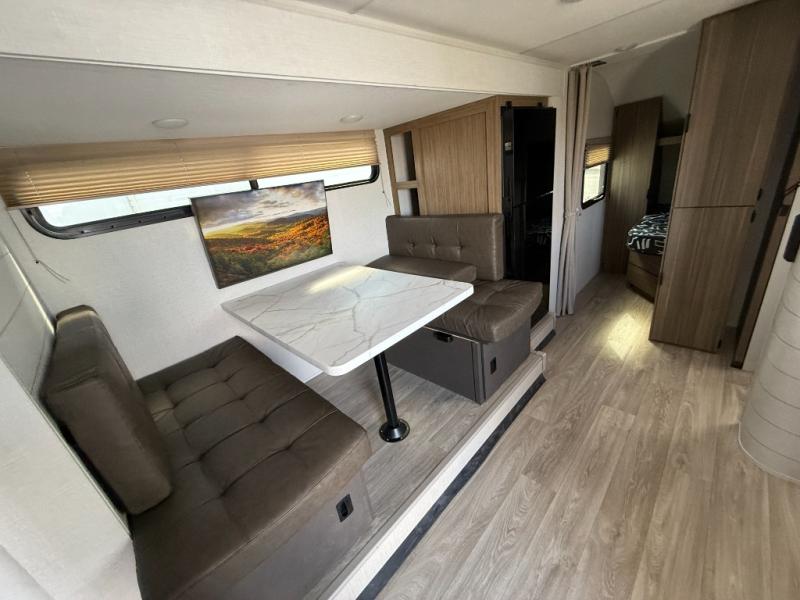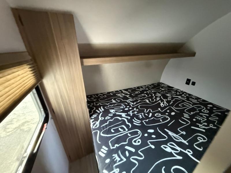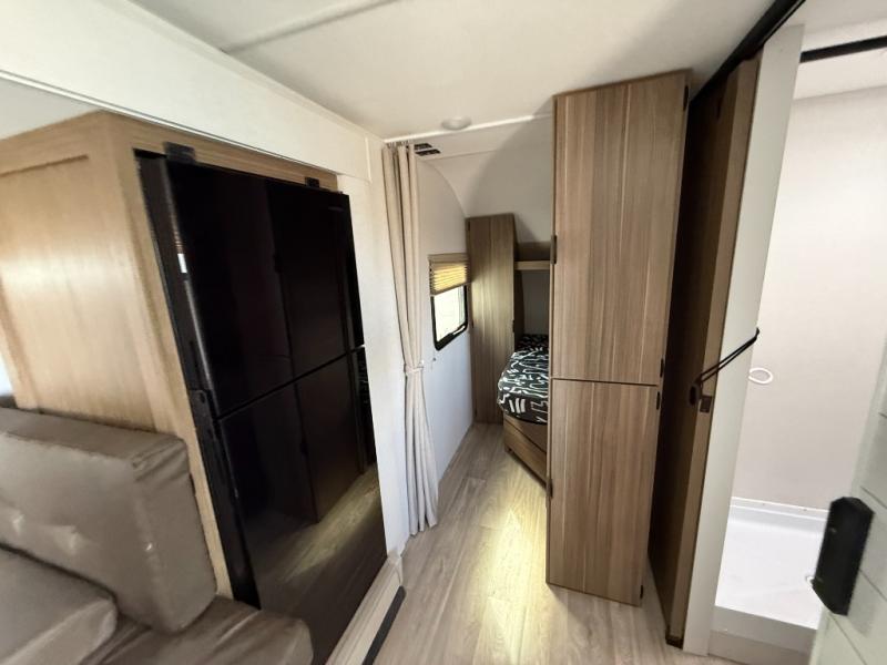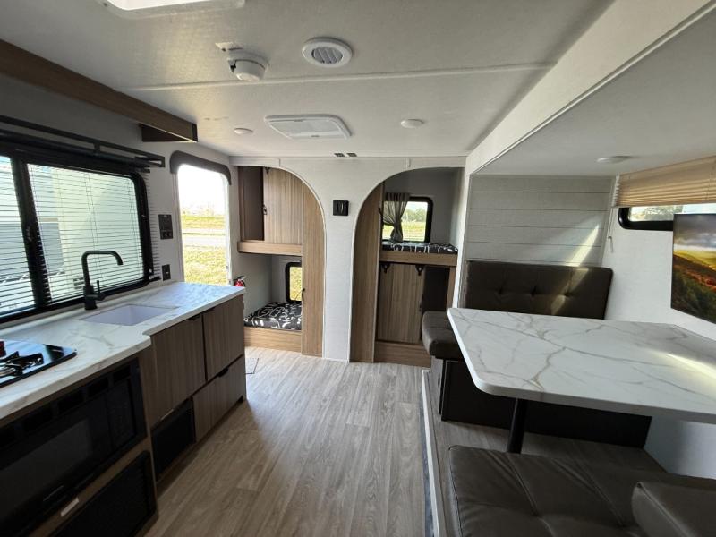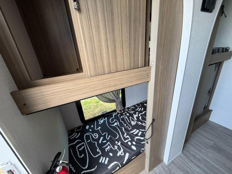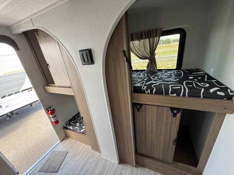 Your guest or little ones will love the bunk beds on this model since each bunk includes a private door which can be shut for privacy! You'll find the front 60" x 72" platform bed to be cozy and convenient since there are overhead cabinets and a closet for your things. Once you've made lunch on the two-burner cooktop, you can dine at the booth dinette slide out. There is also a 12V refrigerator here and shelves for more storage!
