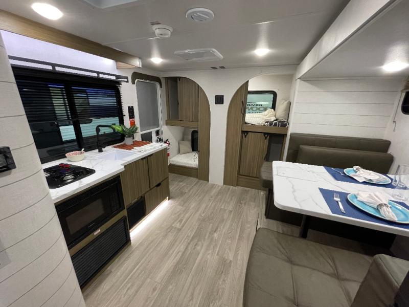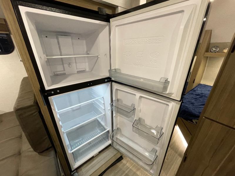 Your guest or little ones will love the bunk beds on this model since each bunk includes a private door which can be shut for privacy! You'll find the front 60" x 72" platform bed to be cozy and convenient since there are overhead cabinets and a closet for your things. Once you've made lunch on the two-burner cooktop, you can dine at the booth dinette slide out. There is also a 12V refrigerator here and shelves for more storage!