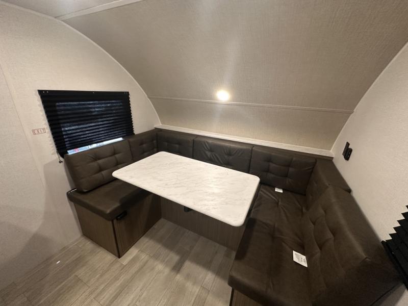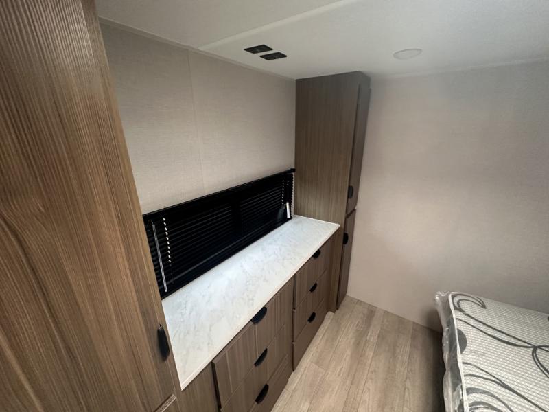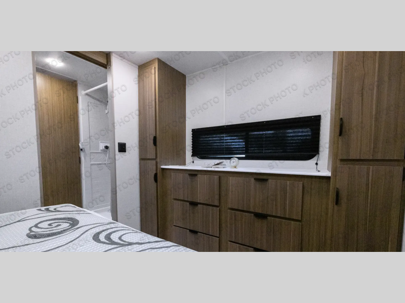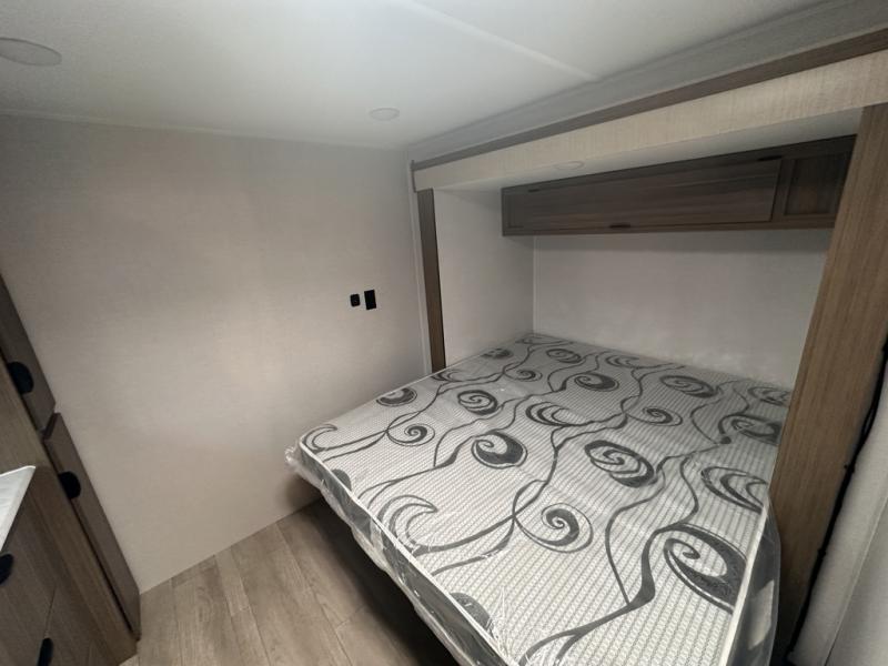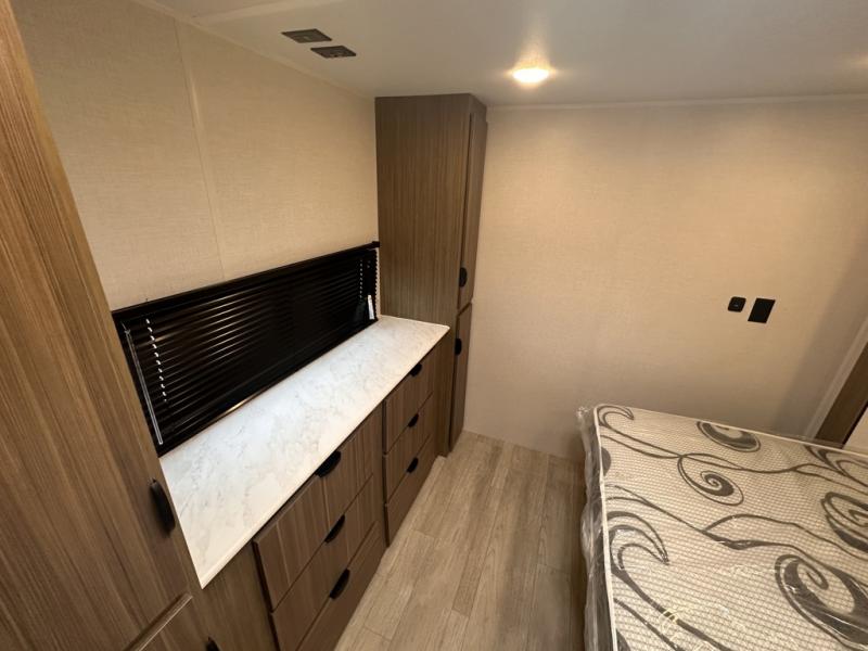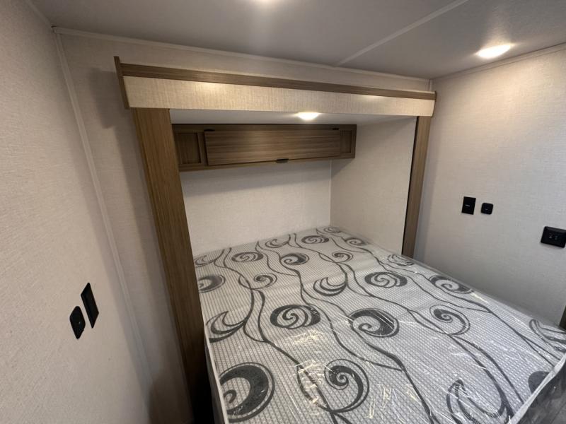 If you like to camp with at-home comforts, this travel trailer is a no-brainer! The front of this model features the U-shaped dinette that can convert to a queen-size bed/sleeping space. The full kitchen includes a three burner cooktop and microwave oven to cook meals. A walk-through bath will lead you to the rear master bedroom where you'll enjoy a queen bed slide out, dual wardrobes, and a dresser to keep clothes where they belong! This model also includes an outside kitchen option, a power awning, and an oversized door for storage access!