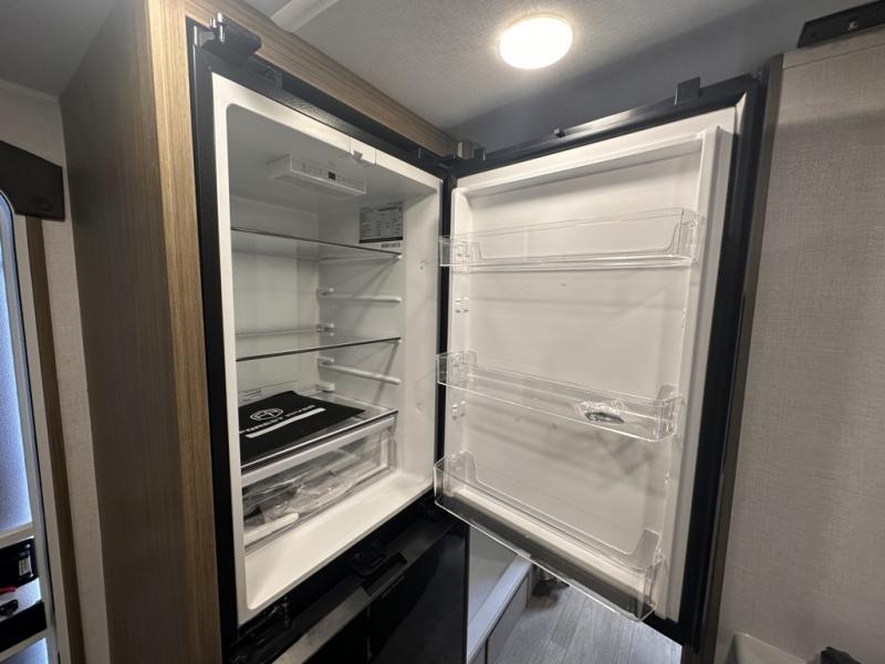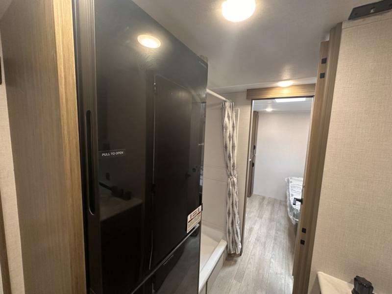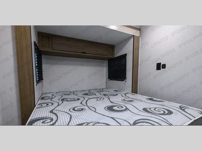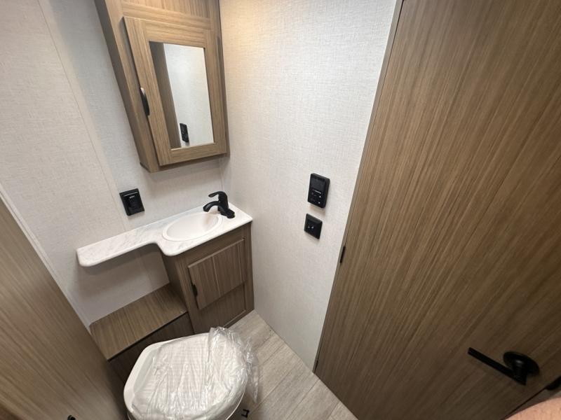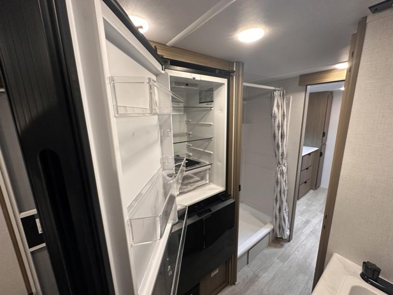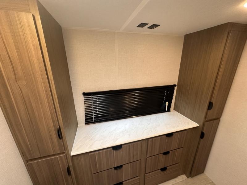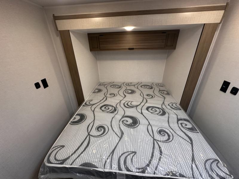 If you like to camp with at-home comforts, this travel trailer is a no-brainer! The front of this model features the U-shaped dinette that can convert to a queen-size bed/sleeping space. The full kitchen includes a three burner cooktop and microwave oven to cook meals. A walk-through bath will lead you to the rear master bedroom where you'll enjoy a queen bed slide out, dual wardrobes, and a dresser to keep clothes where they belong! This model also includes an outside kitchen option, a power awning, and an oversized door for storage access!