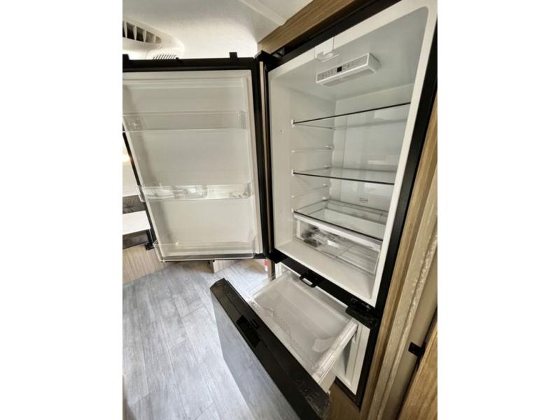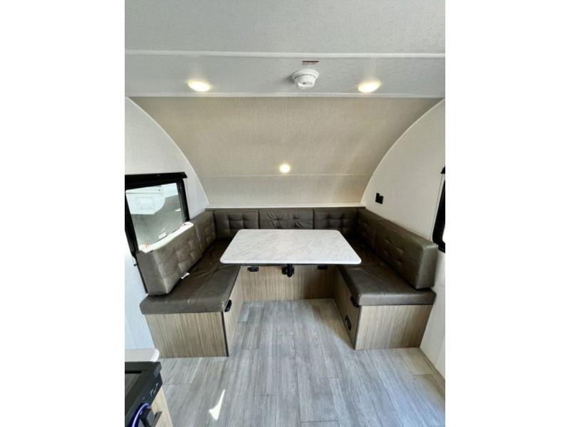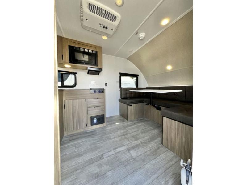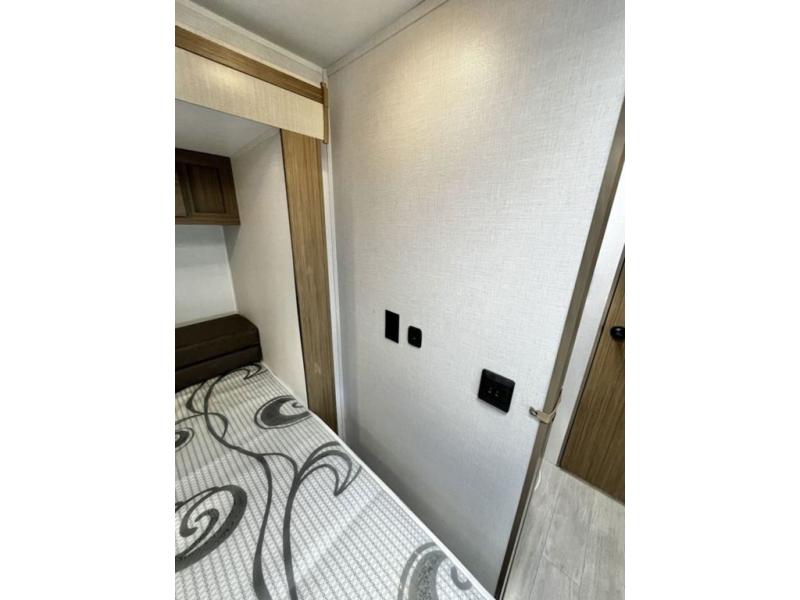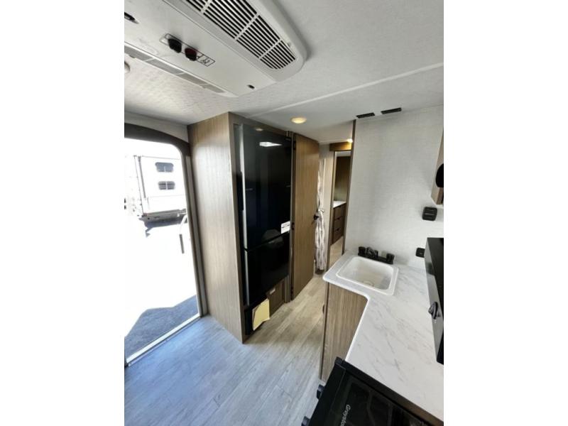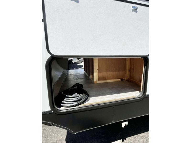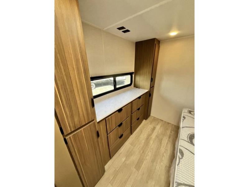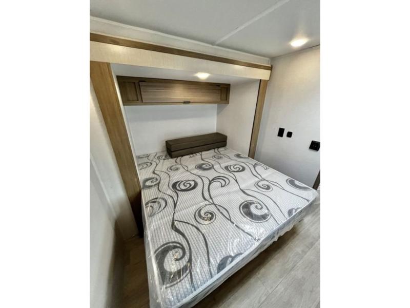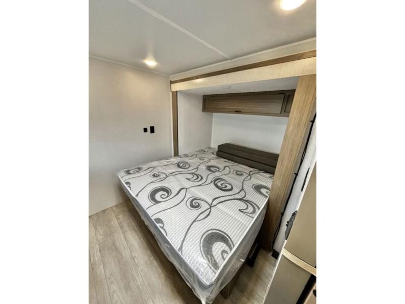 If you like to camp with at-home comforts, this travel trailer is a no-brainer! The front of this model features the U-shaped dinette that can convert to a queen-size bed/sleeping space. The full kitchen includes a three burner cooktop and microwave oven to cook meals. A walk-through bath will lead you to the rear master bedroom where you'll enjoy a queen bed slide out, dual wardrobes, and a dresser to keep clothes where they belong! This model also includes an outside kitchen option, a power awning, and an oversized door for storage access!