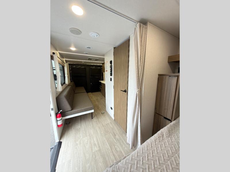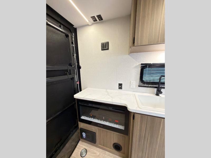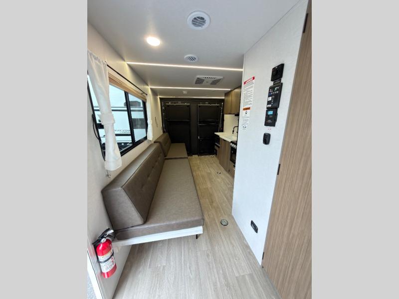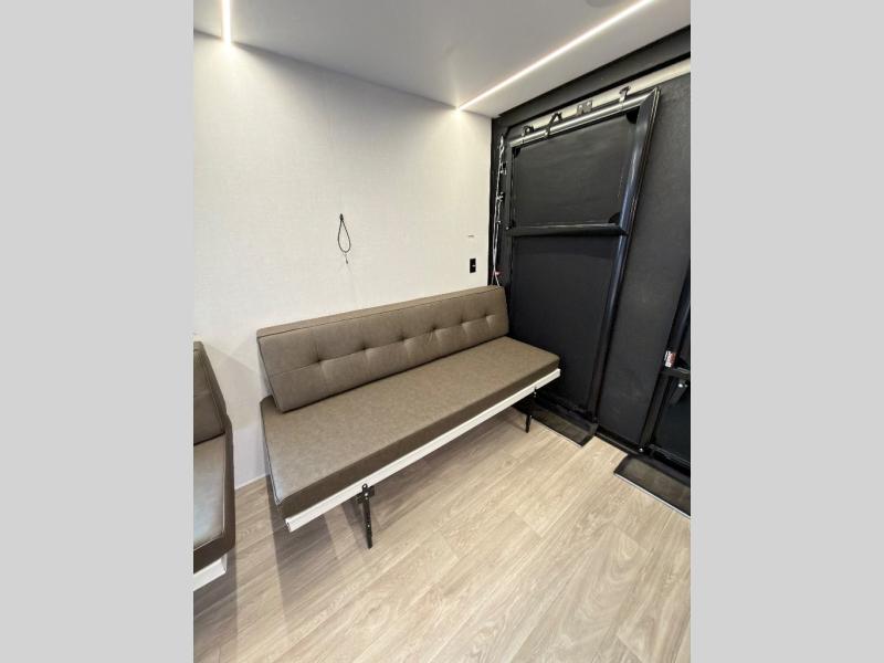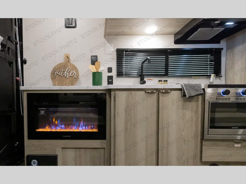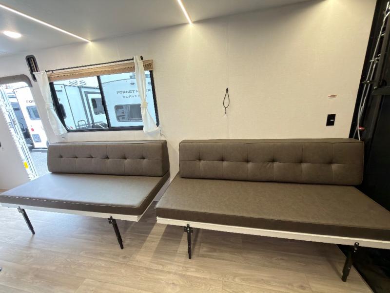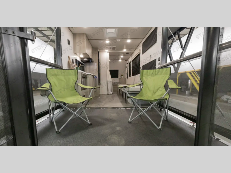 Be ready for anything with this toy hauler in tow! After you've unloaded your toys from the 3,000 lb. ramp door, enjoy the 1,500 lb. capacity patio with a cold drink in hand. There are two sofas inside the garage, plus a fireplace for those chilly nights. The chef of your group will have a full kitchen, complete with a microwave oven and a 12V refrigerator. The full bath includes a shower skylight that will not only let natural light in, but also provide more standing space. And check out the front bedroom with a queen bed and storage space for your belongings.