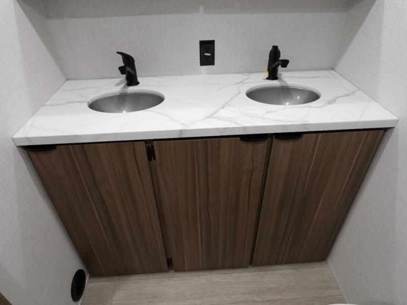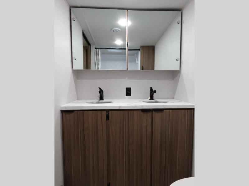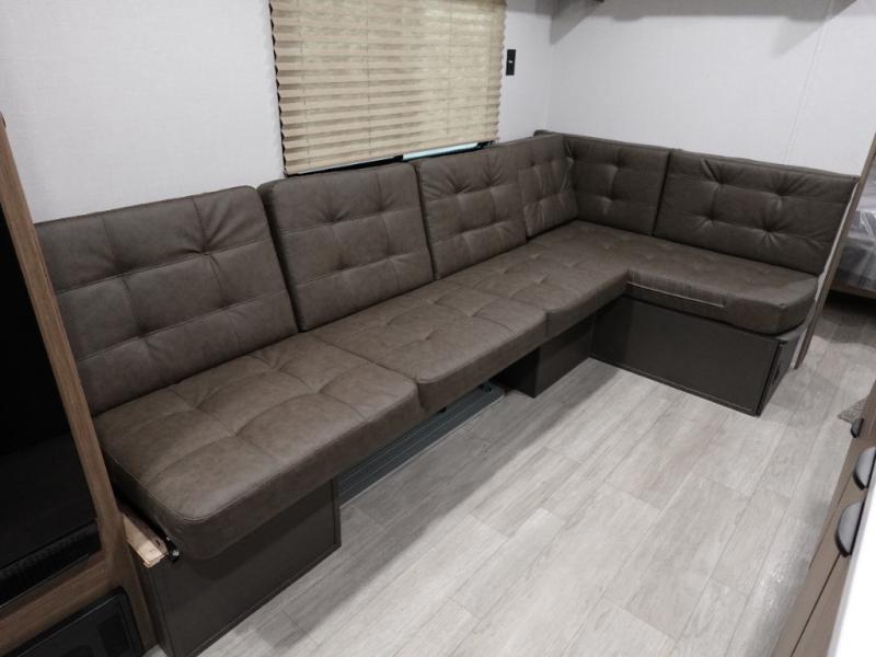 Camping is made easy in this travel trailer with a front private bedroom and a full rear bath with dual bath sink! There are dual bedroom wardrobes to keep your space neat and clean along with a king bed for more space to stretch out. Everyone can meet in the combined kitchen and living room to relax on the super U-lounge with a removable table while the chef of your group makes breakfast on the two burner cooktop. There is also a microwave oven for quick meals, plus a pantry and large under counter refrigerator for food storage!