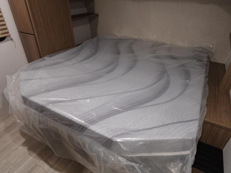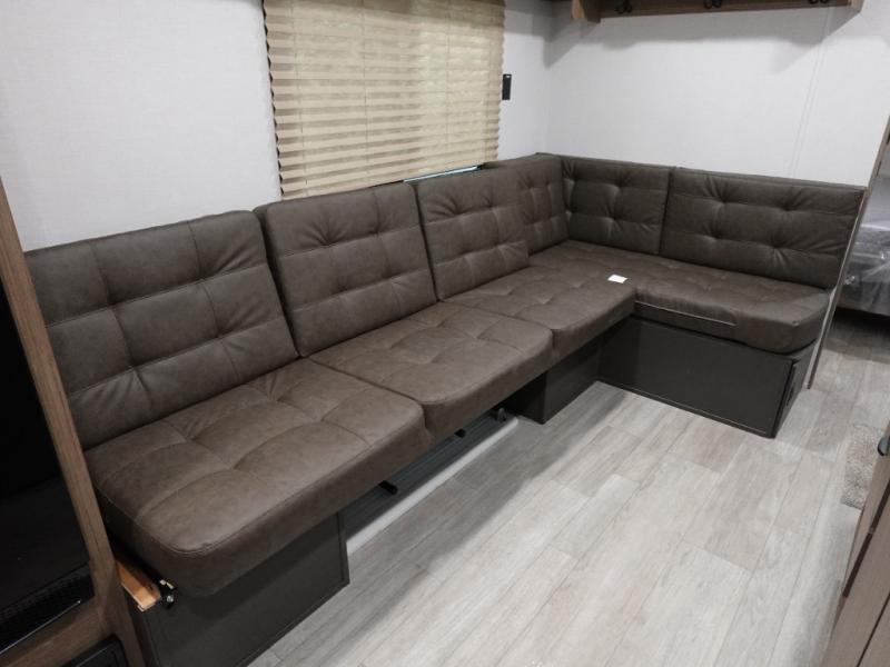 Camping is made easy in this travel trailer with a front private bedroom and a full rear bath with dual bath sink! There are dual bedroom wardrobes to keep your space neat and clean along with a king bed for more space to stretch out. Everyone can meet in the combined kitchen and living room to relax on the super U-lounge with a removable table while the chef of your group makes breakfast on the two burner cooktop. There is also a microwave oven for quick meals, plus a pantry and large under counter refrigerator for food storage!
