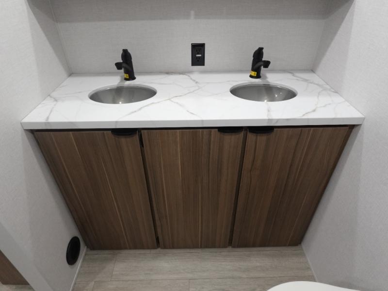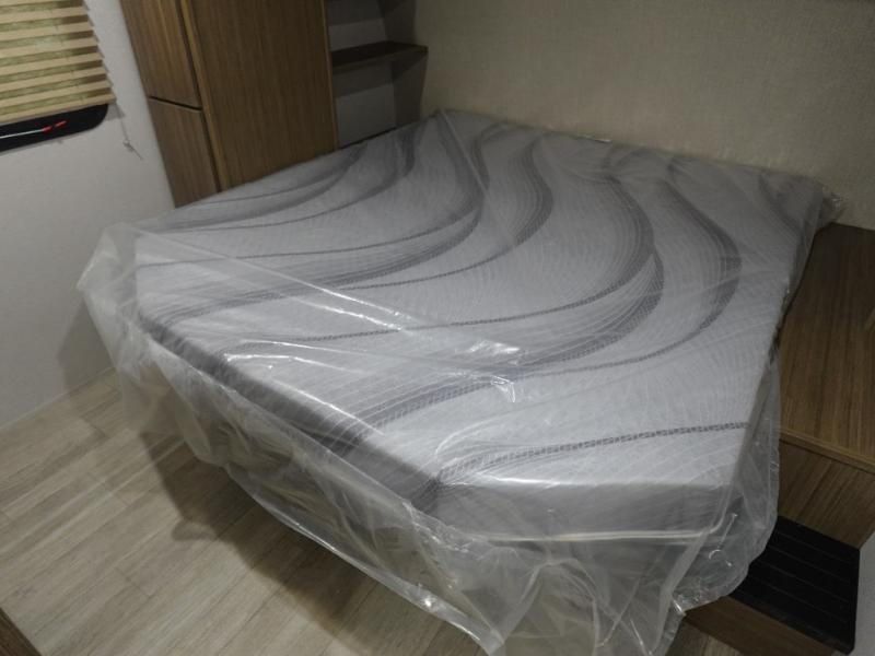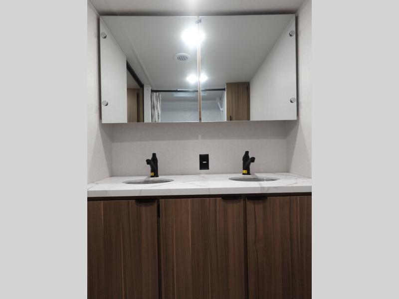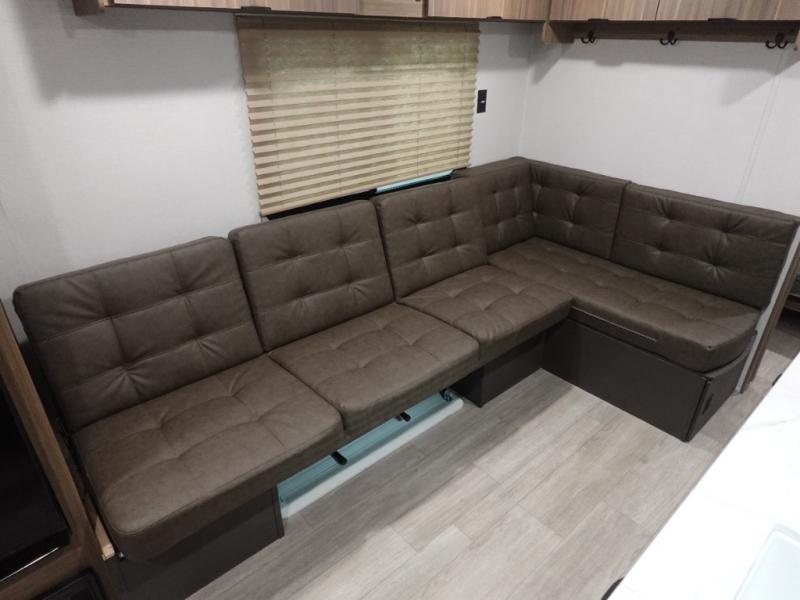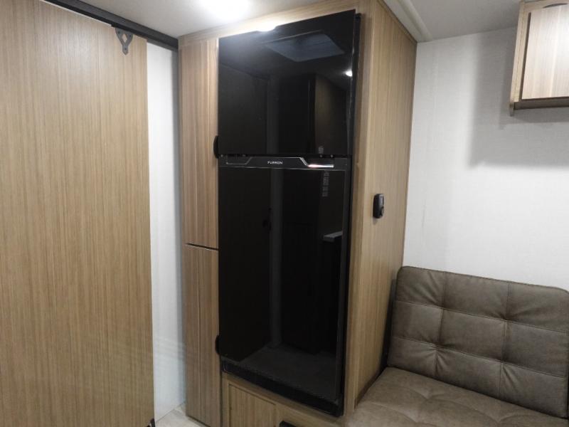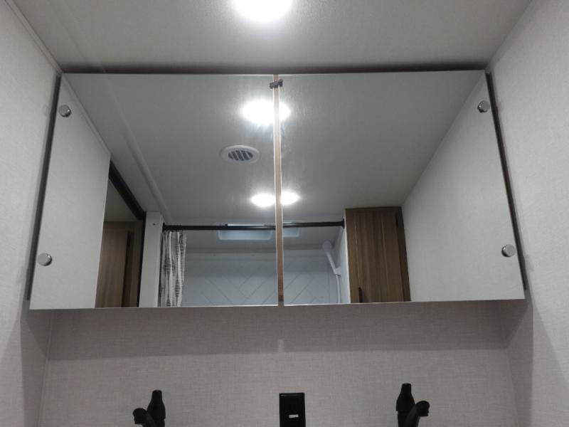 Camping is made easy in this travel trailer with a front private bedroom and a full rear bath with dual bath sink! There are dual bedroom wardrobes to keep your space neat and clean along with a king bed for more space to stretch out. Everyone can meet in the combined kitchen and living room to relax on the super U-lounge with a removable table while the chef of your group makes breakfast on the two burner cooktop. There is also a microwave oven for quick meals, plus a pantry and large under counter refrigerator for food storage!