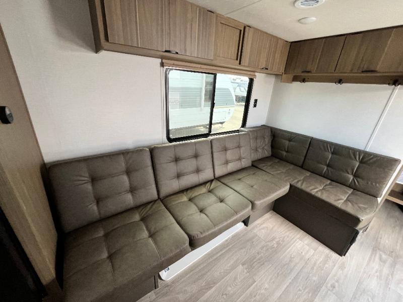 Camping is made easy in this travel trailer with a front private bedroom and a full rear bath with dual bath sink! There are dual bedroom wardrobes to keep your space neat and clean along with a king bed for more space to stretch out. Everyone can meet in the combined kitchen and living room to relax on the super U-lounge with a removable table while the chef of your group makes breakfast on the two burner cooktop. There is also a microwave oven for quick meals, plus a pantry and large under counter refrigerator for food storage!