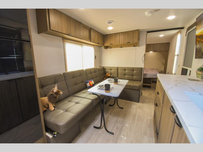 Camping is made easy in this travel trailer with a front private bedroom and a full rear bath with dual bath sink! There are dual bedroom wardrobes to keep your space neat and clean along with a king bed for more space to stretch out. Everyone can meet in the combined kitchen and living room to relax on the super U-lounge with a removable table while the chef of your group makes breakfast on the two burner cooktop. There is also a microwave oven for quick meals, plus a pantry and large under counter refrigerator for food storage!