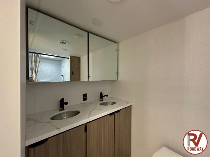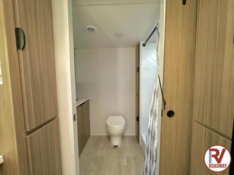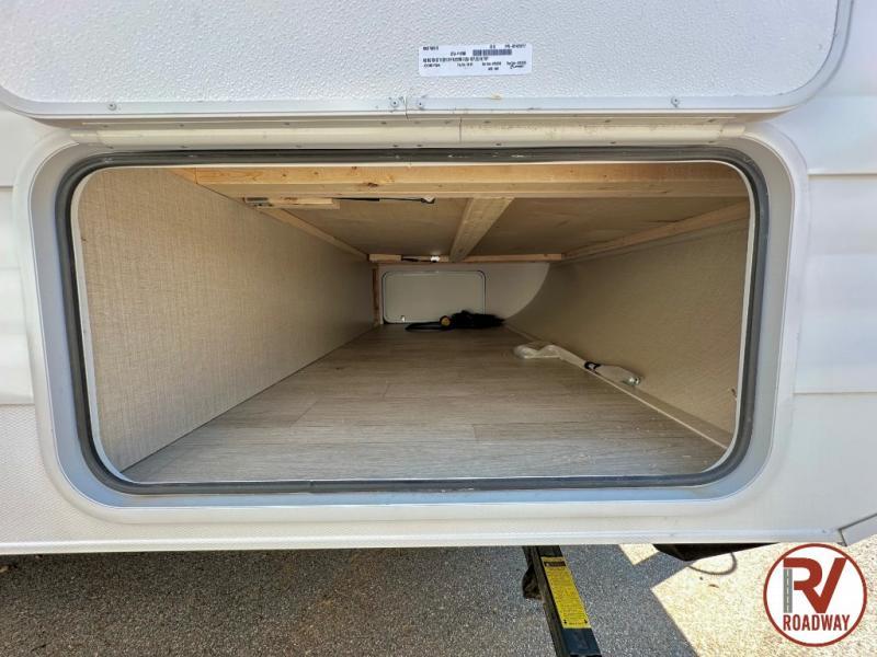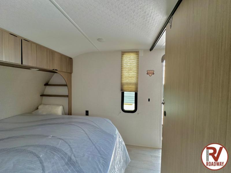 Camping is made easy in this travel trailer with a front private bedroom and a full rear bath with dual bath sink! There are dual bedroom wardrobes to keep your space neat and clean along with a king bed for more space to stretch out. Everyone can meet in the combined kitchen and living room to relax on the super U-lounge with a removable table while the chef of your group makes breakfast on the two burner cooktop. There is also a microwave oven for quick meals, plus a pantry and large under counter refrigerator for food storage!