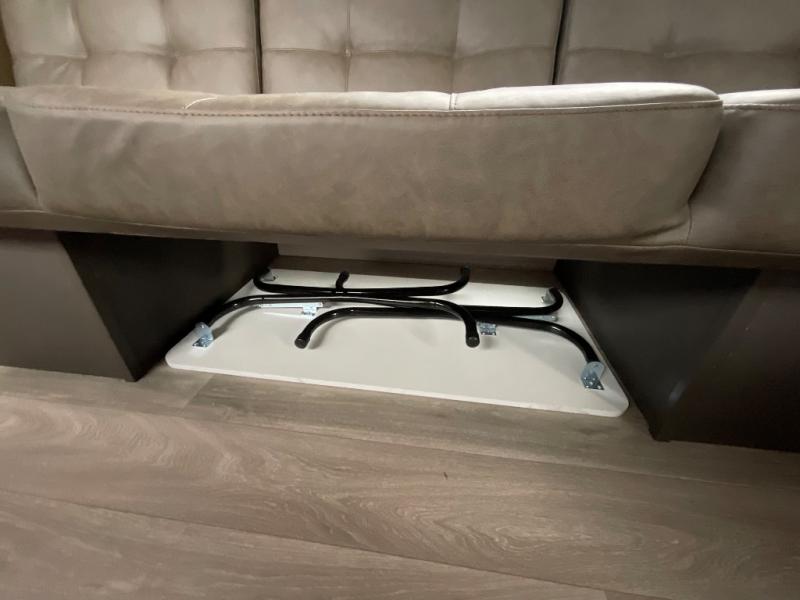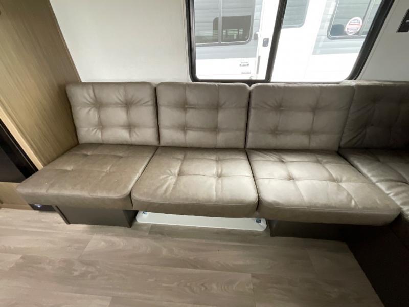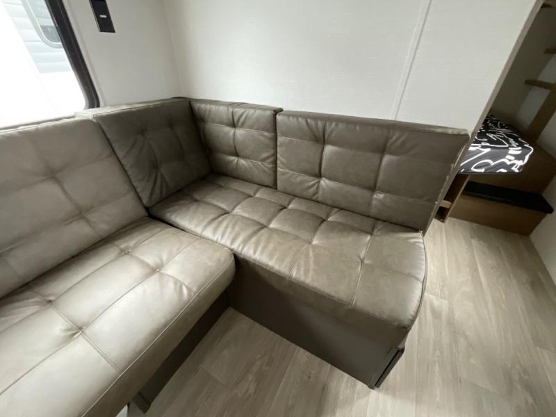 Camping is made easy in this travel trailer with a front private bedroom and a full rear bath with dual bath sink! There are dual bedroom wardrobes to keep your space neat and clean along with a king bed for more space to stretch out. Everyone can meet in the combined kitchen and living room to relax on the super U-lounge with a removable table while the chef of your group makes breakfast on the two burner cooktop. There is also a microwave oven for quick meals, plus a pantry and large under counter refrigerator for food storage!