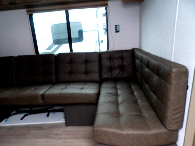 Camping is made easy in this travel trailer with a front private bedroom and a full rear bath with dual bath sink! There are dual bedroom wardrobes to keep your space neat and clean along with a king bed for more space to stretch out. Everyone can meet in the combined kitchen and living room to relax on the super U-lounge with a removable table while the chef of your group makes breakfast on the two burner cooktop. There is also a microwave oven for quick meals, plus a pantry and large under counter refrigerator for food storage!