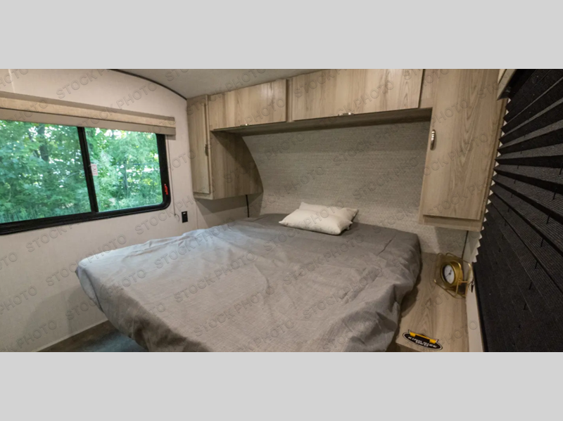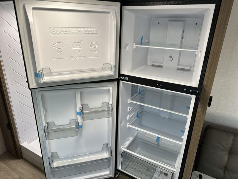 Camping is made easy in this travel trailer with a front private bedroom and a full rear bath with dual bath sink! There are dual bedroom wardrobes to keep your space neat and clean along with a king bed for more space to stretch out. Everyone can meet in the combined kitchen and living room to relax on the super U-lounge with a removable table while the chef of your group makes breakfast on the two burner cooktop. There is also a microwave oven for quick meals, plus a pantry and large under counter refrigerator for food storage!