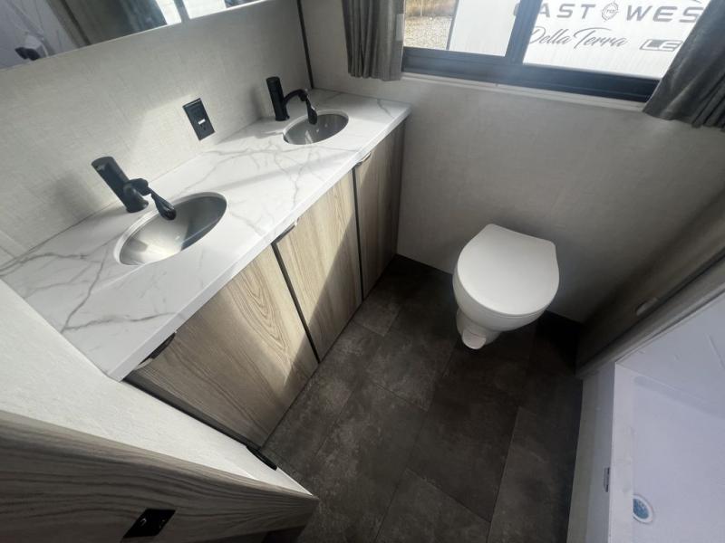 Camping is made easy in this travel trailer with a front private bedroom and a full rear bath with dual bath sink! There are dual bedroom wardrobes to keep your space neat and clean along with a king bed for more space to stretch out. Everyone can meet in the combined kitchen and living room to relax on the super U-lounge with a removable table while the chef of your group makes breakfast on the two-burner cooktop. There is also a microwave oven for quick meals, plus a pantry and large under counter refrigerator for food storage!