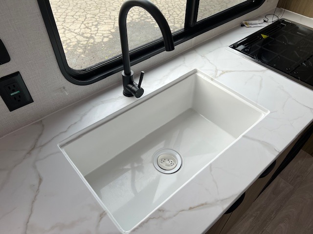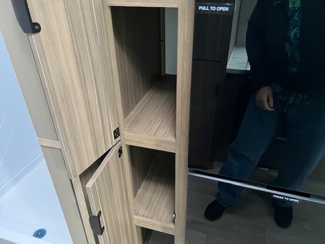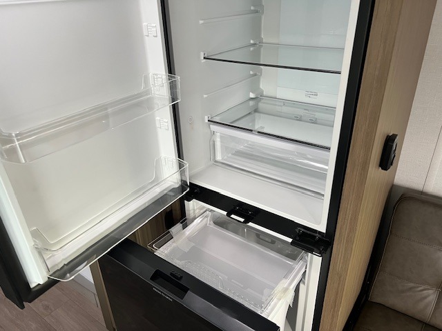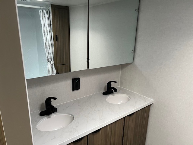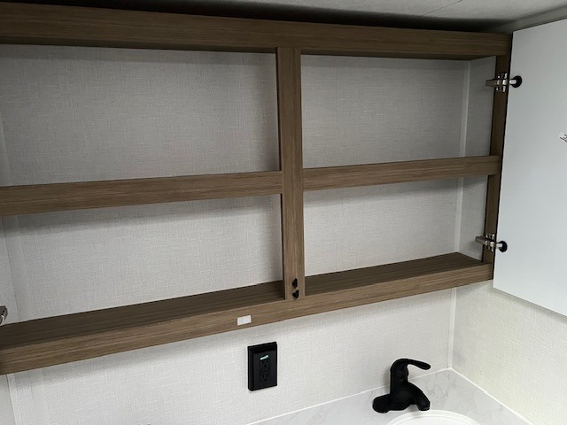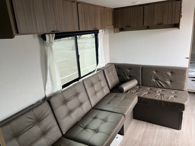 Camping is made easy in this travel trailer with a front private bedroom and a full rear bath with dual bath sink! There are dual bedroom wardrobes to keep your space neat and clean along with a king bed for more space to stretch out. Everyone can meet in the combined kitchen and living room to relax on the super U-lounge with a removable table while the chef of your group makes breakfast on the two-burner cooktop. There is also a microwave oven for quick meals, plus a pantry and large under counter refrigerator for food storage!