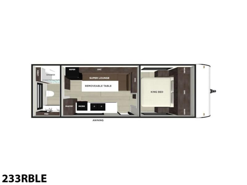 Camping is made easy in this travel trailer with a front private bedroom and a full rear bath with dual bath sink! There are dual bedroom wardrobes to keep your space neat and clean along with a king bed for more space to stretch out. Everyone can meet in the combined kitchen and living room to relax on the super U-lounge with a removable table while the chef of your group makes breakfast on the two-burner cooktop. There is also a microwave oven for quick meals, plus a pantry and large under counter refrigerator for food storage!