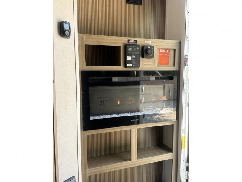 This toy hauler is packed to the Max with standard features and comforts. Once you unload your toys from the garage with a total of 13' 4" cargo space, you can enjoy lunch at the sofa/sleepers with a table. The kitchen includes a 12V refrigerator, and everyone will love the fireplace for a more at-home feel. Head through the bath to enjoy the front master bedroom with a king bed and dual wardrobes for your clothes!
