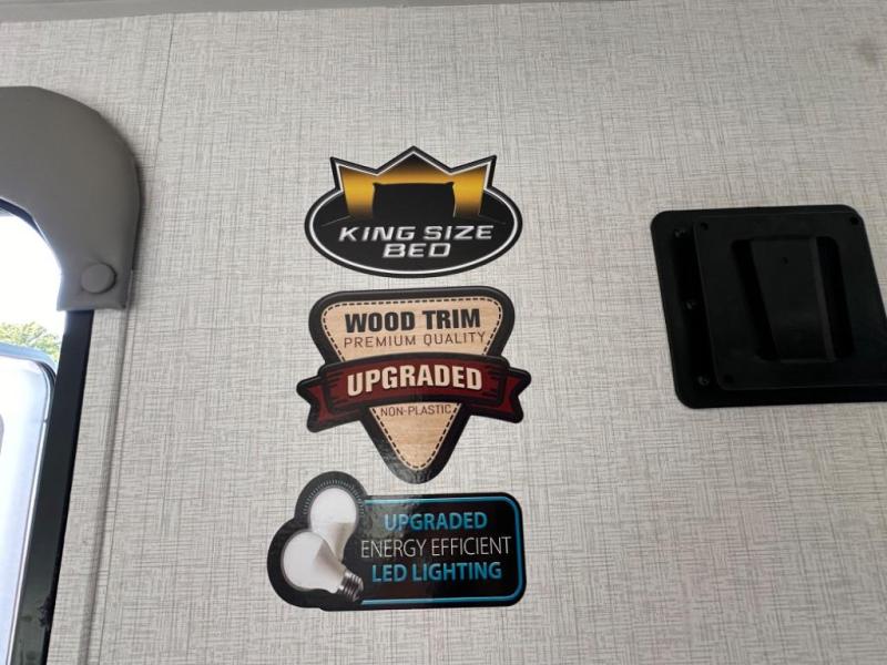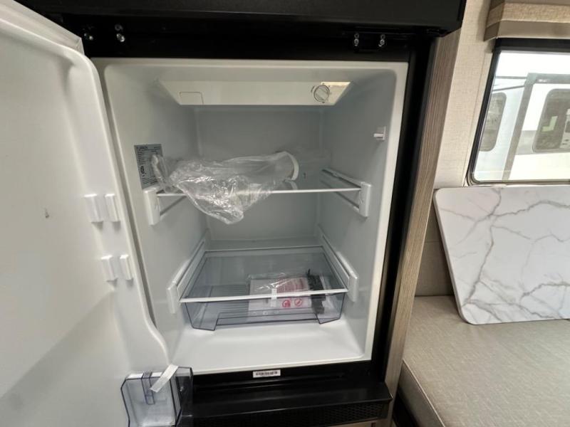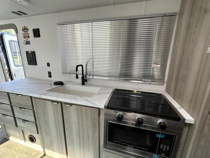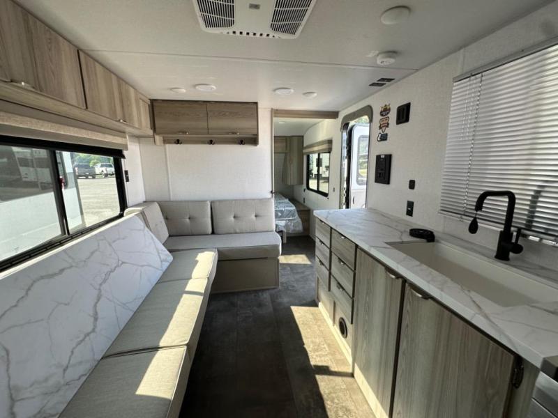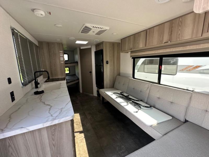 Camping is made easy in this travel trailer with more sleeping space and lots of comforts! The kids or your guests will enjoy the double-size bunks in the back, along with the full bath close by for easy nighttime use. You'll have the front private bedroom with a king bed all to yourselves, and there are dual bedroom wardrobes to keep your space neat and clean. Everyone can meet in the combined kitchen and living room to relax on the super U-lounge with a removable table while the chef of your group makes breakfast on the two burner cooktop. There is also a microwave oven for quick meals, plus a pantry and large under counter refrigerator for food storage!