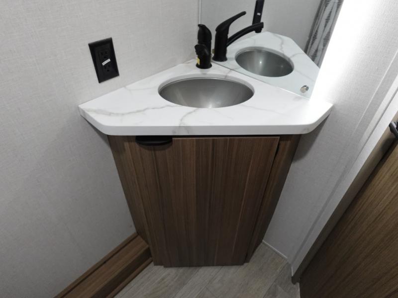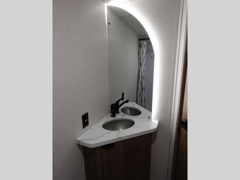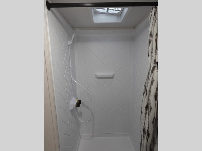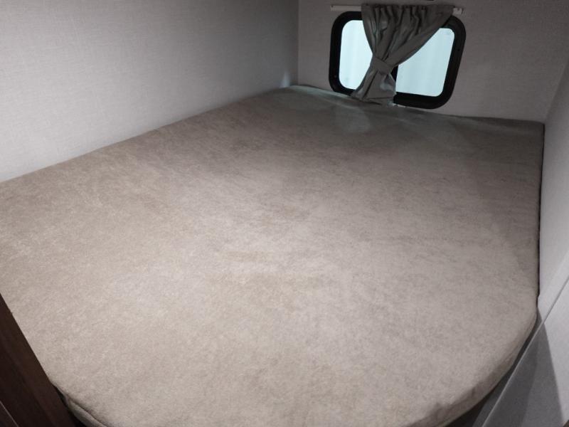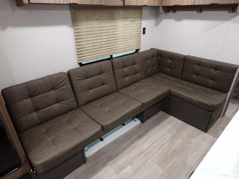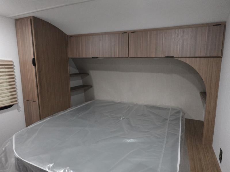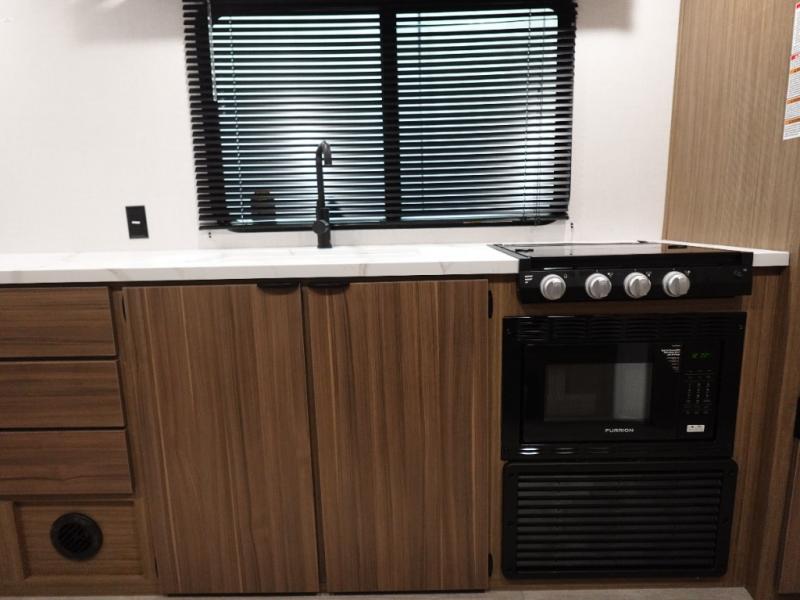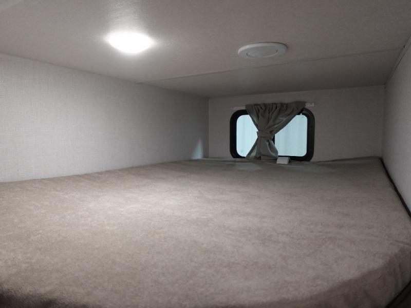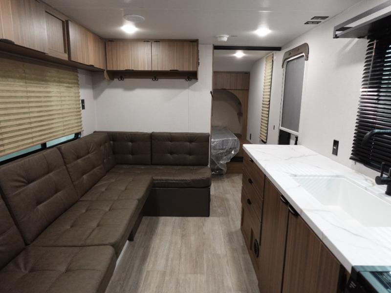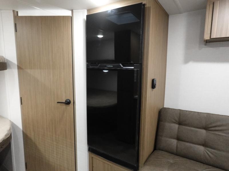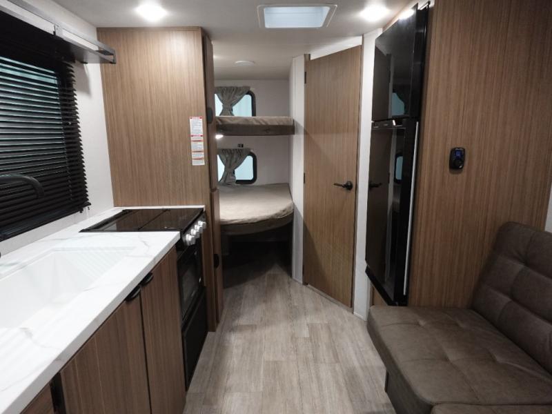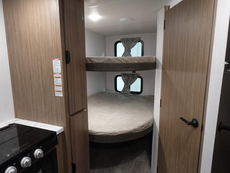 Camping is made easy in this travel trailer with more sleeping space and lots of comforts! The kids or your guests will enjoy the double-size bunks in the back, along with the full bath close by for easy nighttime use. You'll have the front private bedroom with a king bed all to yourselves, and there are dual bedroom wardrobes to keep your space neat and clean. Everyone can meet in the combined kitchen and living room to relax on the super U-lounge with a removable table while the chef of your group makes breakfast on the two burner cooktop. There is also a microwave oven for quick meals, plus a pantry and large under counter refrigerator for food storage!
