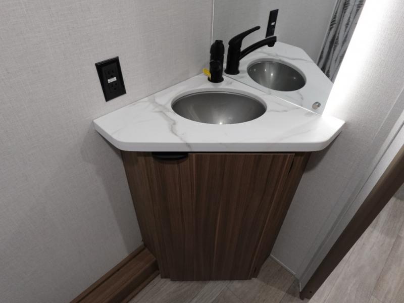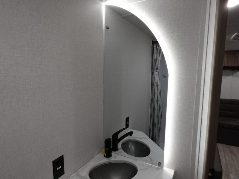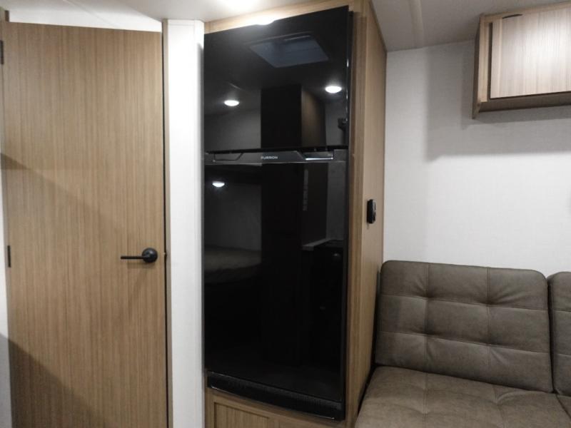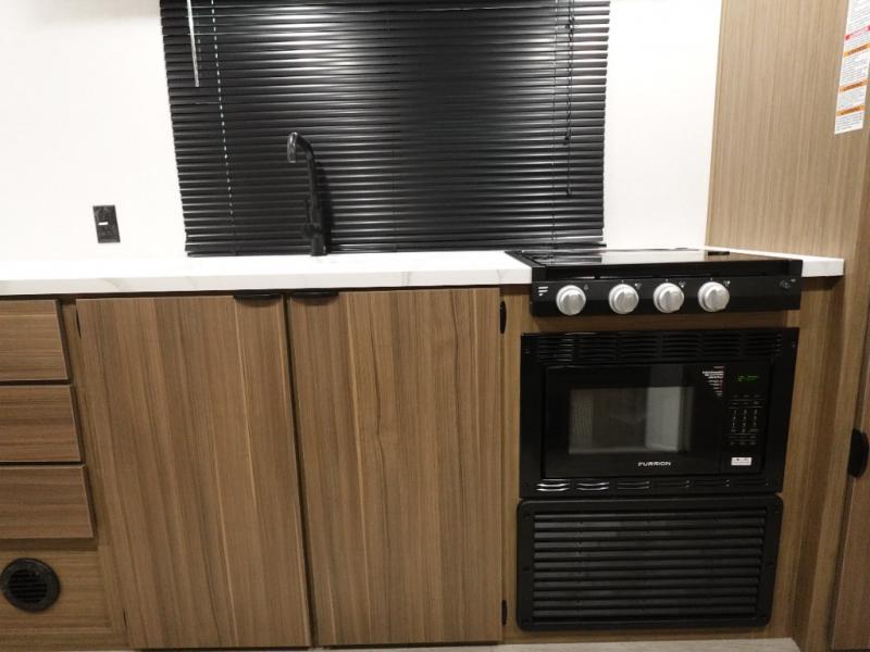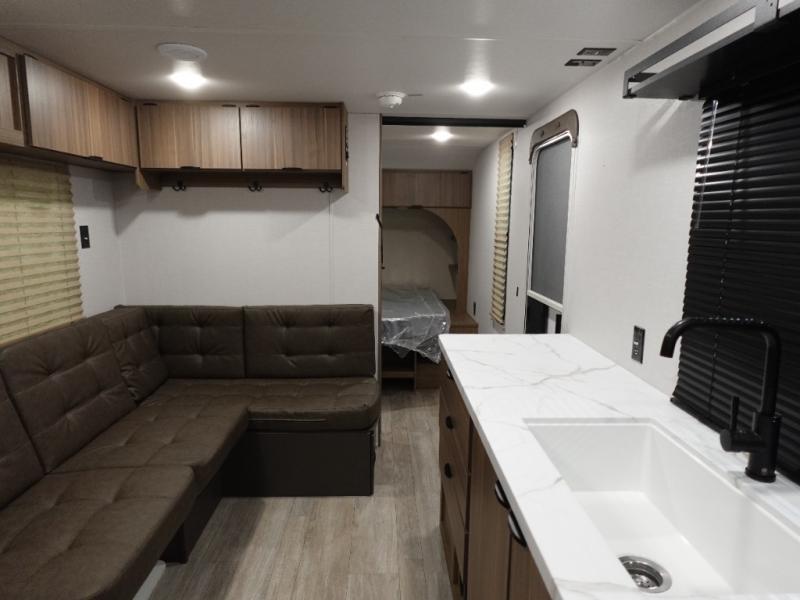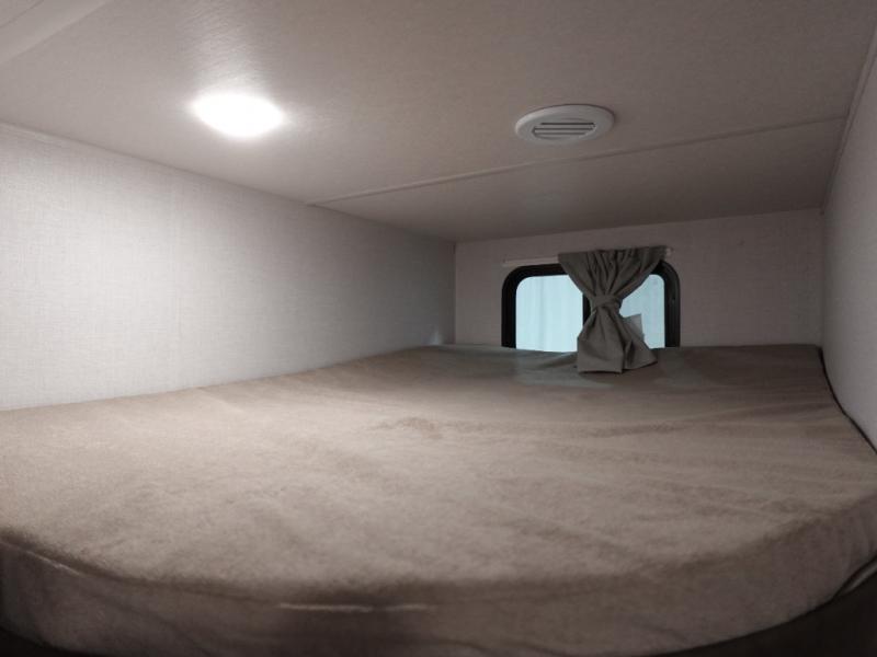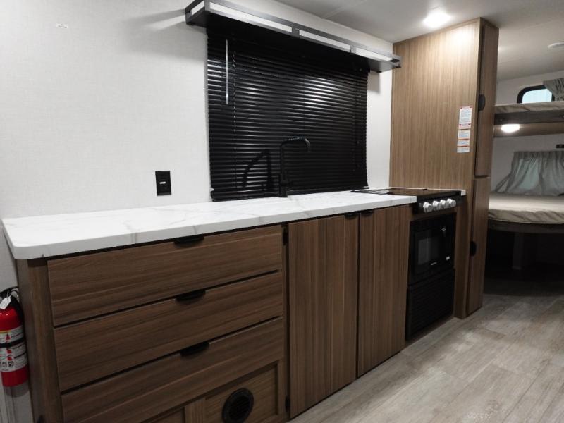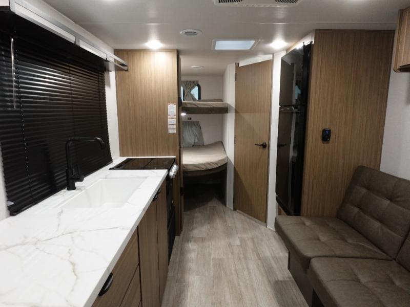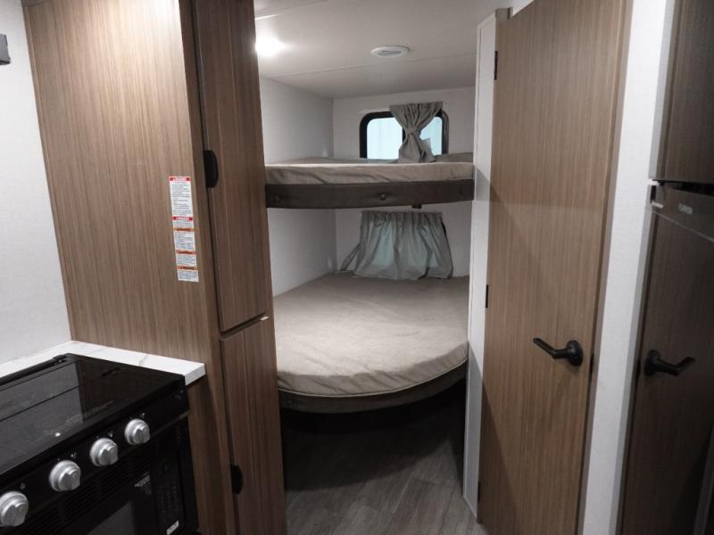 Camping is made easy in this travel trailer with more sleeping space and lots of comforts! The kids or your guests will enjoy the double-size bunks in the back, along with the full bath close by for easy nighttime use. You'll have the front private bedroom with a king bed all to yourselves, and there are dual bedroom wardrobes to keep your space neat and clean. Everyone can meet in the combined kitchen and living room to relax on the super U-lounge with a removable table while the chef of your group makes breakfast on the two burner cooktop. There is also a microwave oven for quick meals, plus a pantry and large under counter refrigerator for food storage!