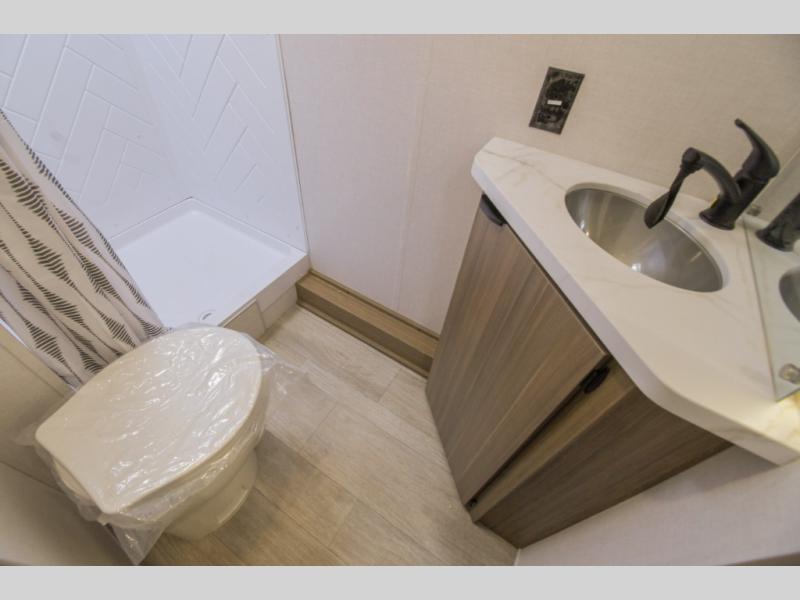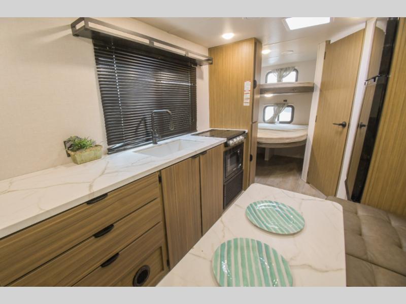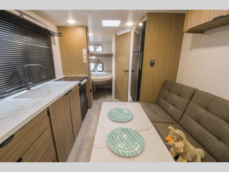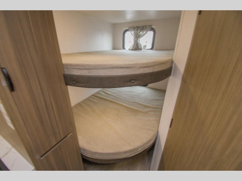 Camping is made easy in this travel trailer with more sleeping space and lots of comforts! The kids or your guests will enjoy the double-size bunks in the back, along with the full bath close by for easy nighttime use. You'll have the front private bedroom with a king bed all to yourselves, and there are dual bedroom wardrobes to keep your space neat and clean. Everyone can meet in the combined kitchen and living room to relax on the super U-lounge with a removable table while the chef of your group makes breakfast on the two burner cooktop. There is also a microwave oven for quick meals, plus a pantry and large under counter refrigerator for food storage!