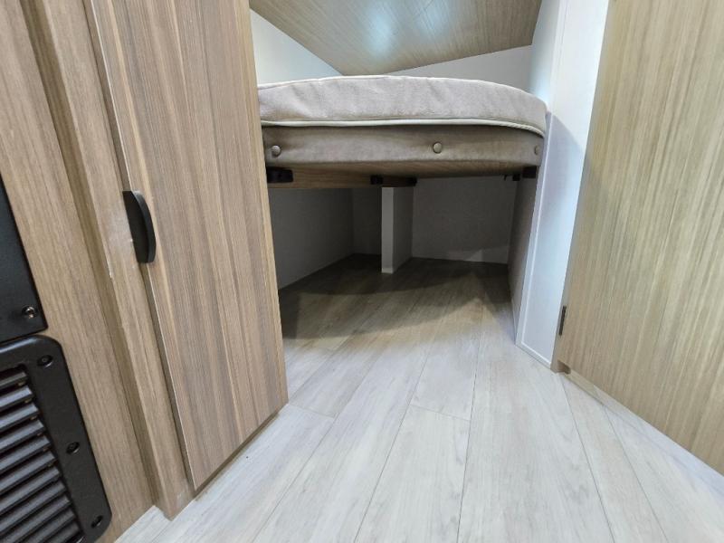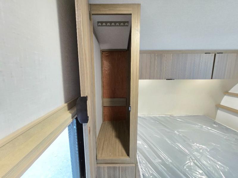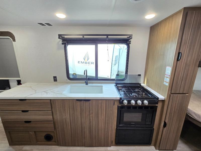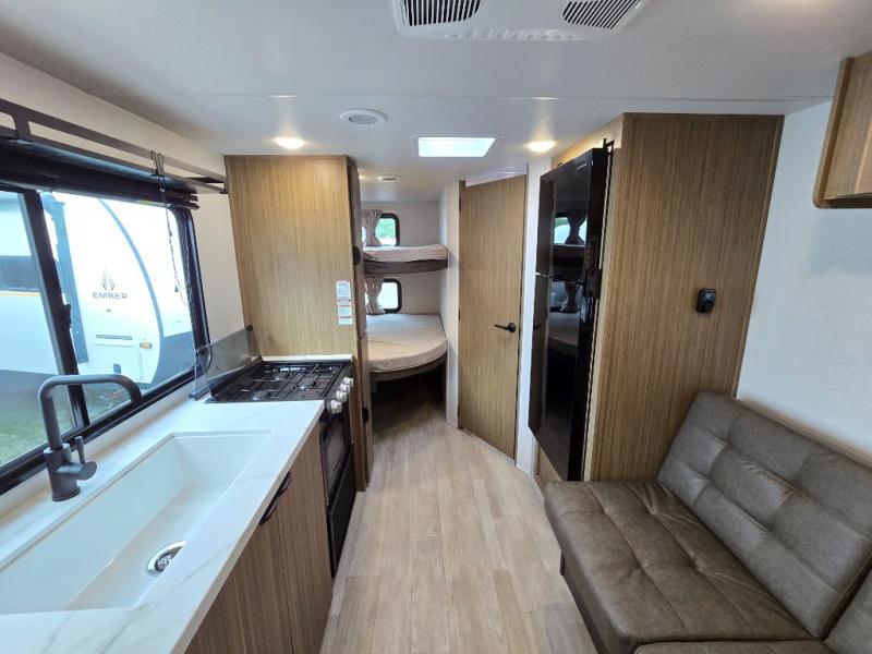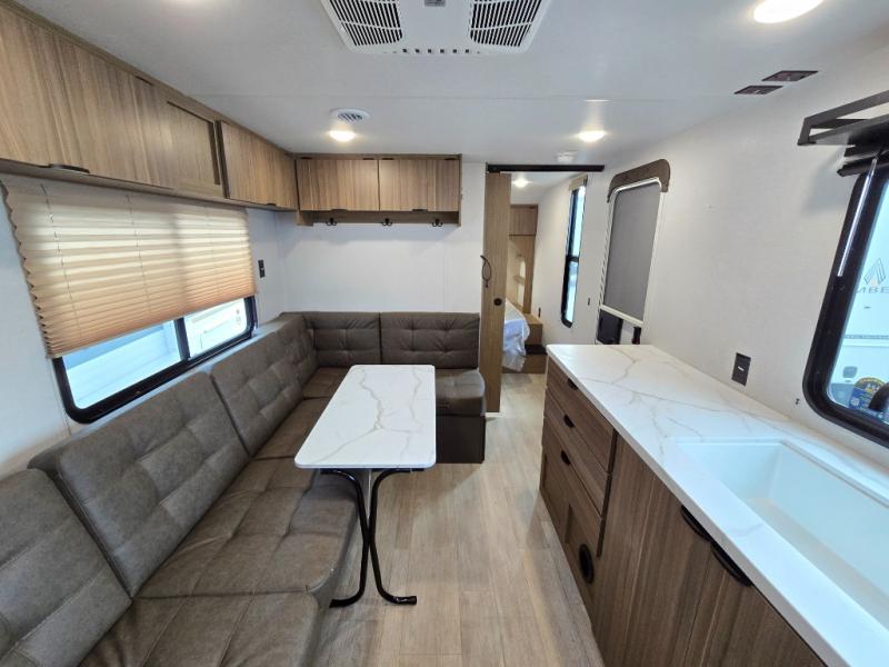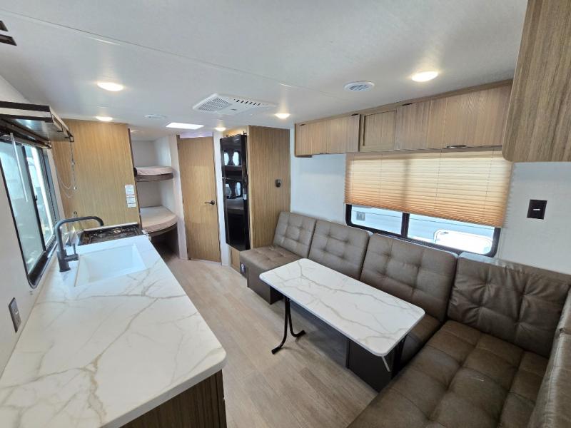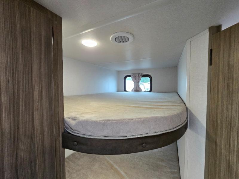 Camping is made easy in this travel trailer with more sleeping space and lots of comforts! The kids or your guests will enjoy the double-size bunks in the back, along with the full bath close by for easy nighttime use. You'll have the front private bedroom with a king bed all to yourselves, and there are dual bedroom wardrobes to keep your space neat and clean. Everyone can meet in the combined kitchen and living room to relax on the super U-lounge with a removable table while the chef of your group makes breakfast on the two burner cooktop. There is also a microwave oven for quick meals, plus a pantry and large under counter refrigerator for food storage!