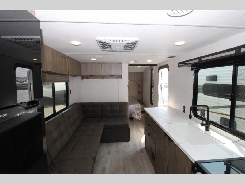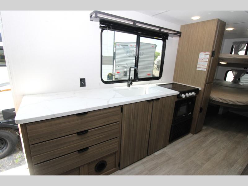 Camping is made easy in this travel trailer with more sleeping space and lots of comforts! The kids or your guests will enjoy the double-size bunks in the back, along with the full bath close by for easy nighttime use. You'll have the front private bedroom with a king bed all to yourselves, and there are dual bedroom wardrobes to keep your space neat and clean. Everyone can meet in the combined kitchen and living room to relax on the super U-lounge with a removable table while the chef of your group makes breakfast on the two burner cooktop. There is also a microwave oven for quick meals, plus a pantry and large under counter refrigerator for food storage!
