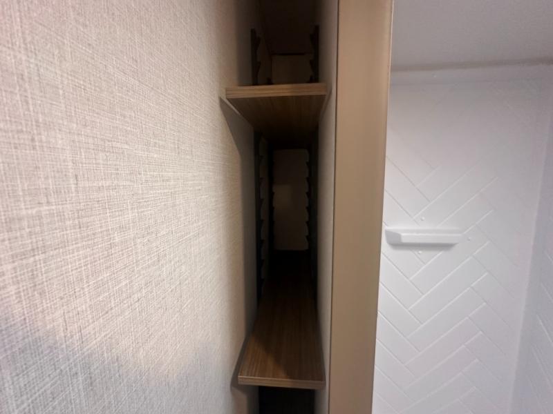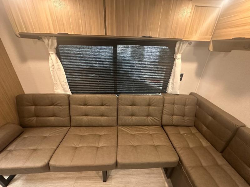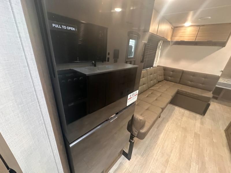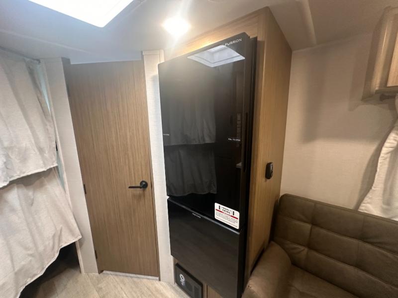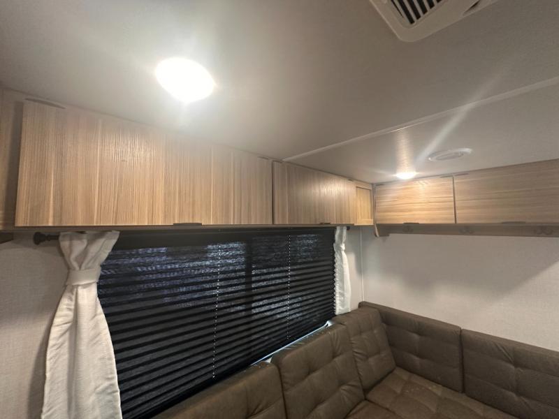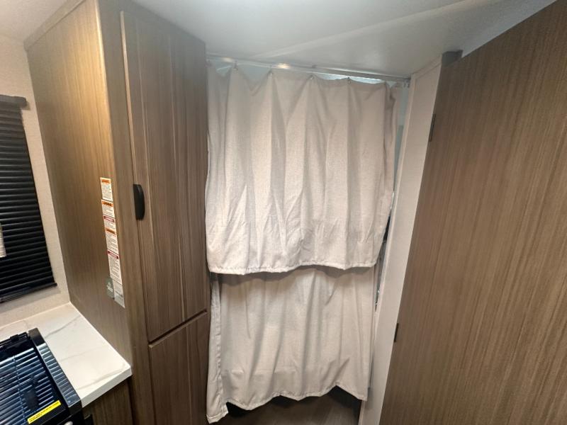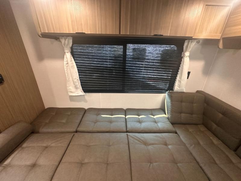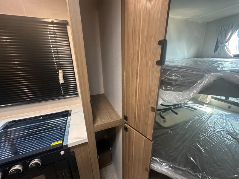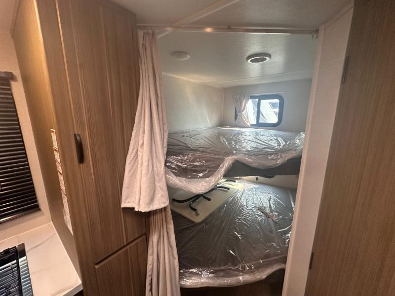 Camping is made easy in this travel trailer with more sleeping space and lots of comforts! The kids or your guests will enjoy the double-size bunks in the back, along with the full bath close by for easy nighttime use. You'll have the front private bedroom with a king bed all to yourselves, and there are dual bedroom wardrobes to keep your space neat and clean. Everyone can meet in the combined kitchen and living room to relax on the super U-lounge with a removable table while the chef of your group makes breakfast on the two burner cooktop. There is also a microwave oven for quick meals, plus a pantry and large under counter refrigerator for food storage!