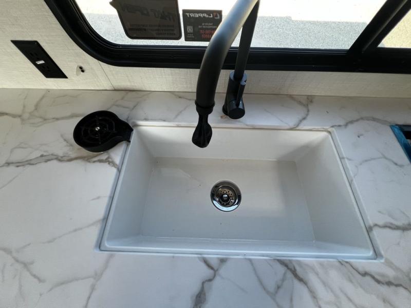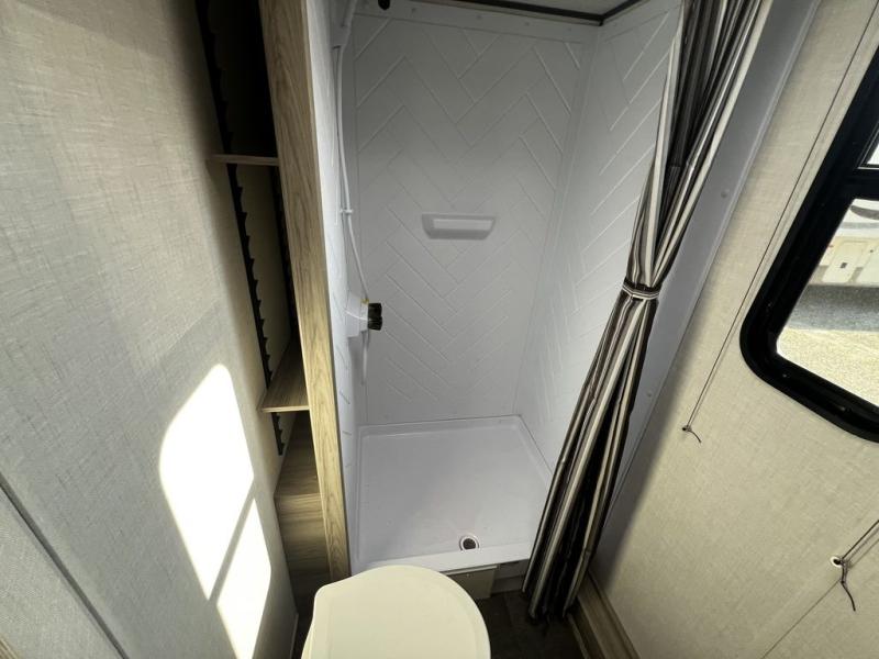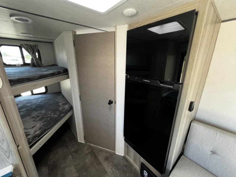 Camping is made easy in this travel trailer with more sleeping space and lots of comforts! The kids or your guests will enjoy the double-size bunks in the back, along with the full bath close by for easy nighttime use. You'll have the front private bedroom with a king bed all to yourselves, and there are dual bedroom wardrobes to keep your space neat and clean. Everyone can meet in the combined kitchen and living room to relax on the super U-lounge with a removable table while the chef of your group makes breakfast on the two-burner cooktop. There is also a microwave oven for quick meals, plus a pantry and large under counter refrigerator for food storage!