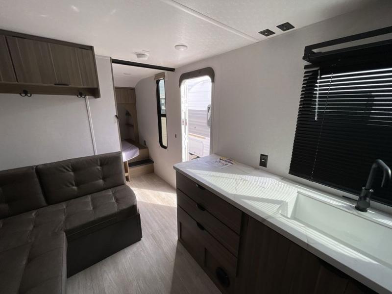 Camping is made easy in this travel trailer with more sleeping space and lots of comforts! The kids or your guests will enjoy the double-size bunks in the back, along with the full bath close by for easy nighttime use. You'll have the front private bedroom with a king bed all to yourselves, and there are dual bedroom wardrobes to keep your space neat and clean. Everyone can meet in the combined kitchen and living room to relax on the super U-lounge with a removable table while the chef of your group makes breakfast on the two burner cooktop. There is also a microwave oven for quick meals, plus a pantry and large under counter refrigerator for food storage!