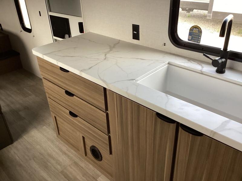 Camping is made easy in this travel trailer with more sleeping space and lots of comforts! The kids or your guests will enjoy the double-size bunks in the back, along with the full bath close by for easy nighttime use. You'll have the front private bedroom with a king bed all to yourselves, and there are dual bedroom wardrobes to keep your space neat and clean. Everyone can meet in the combined kitchen and living room to relax on the super U-lounge with a removable table while the chef of your group makes breakfast on the two burner cooktop. There is also a microwave oven for quick meals, plus a pantry and large under counter refrigerator for food storage!
